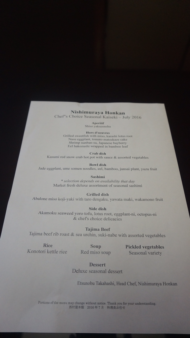 에도시대에 창업하여 약 150년의 전통을 가지고 있는 니시무라야 혼칸은 정감 있는 서비스와 고급스러운 품격으로 방문객들을 맞이하며, 식사 역시 2012년 가이세키 요리 부문 일본 100대 료칸 중 4위를 차지한 료칸답게 양도 질도 기대 이상이며 매년 겨울에는 마쓰바 게를 찾아 일부러 방문하시는 관광객들로 붐빈다고 한다.
