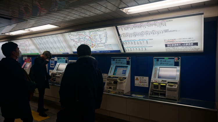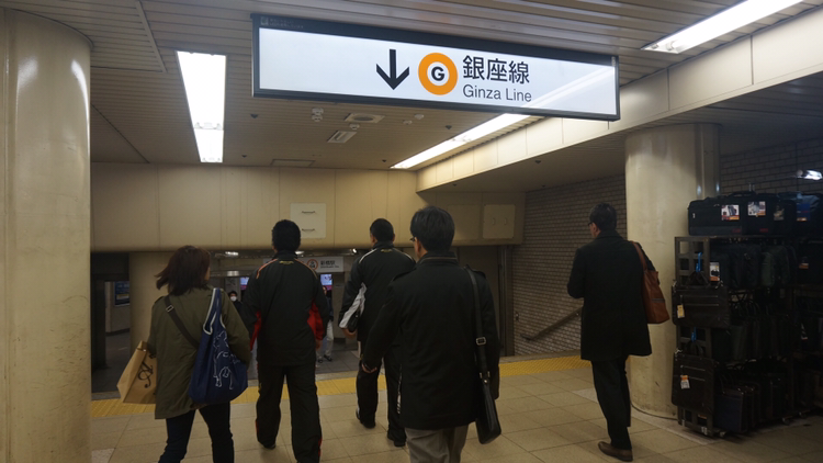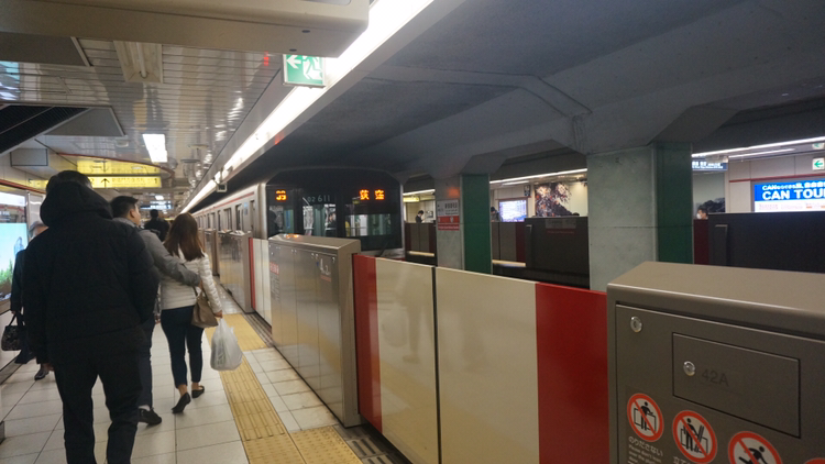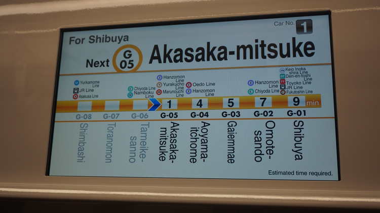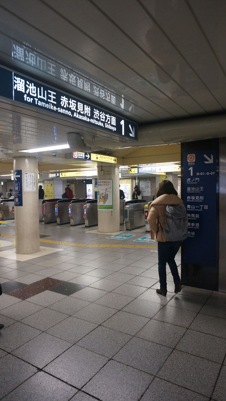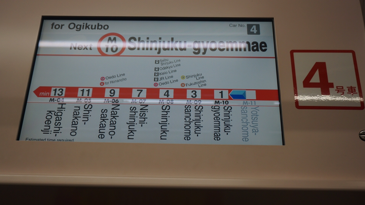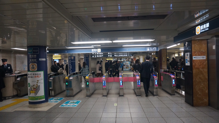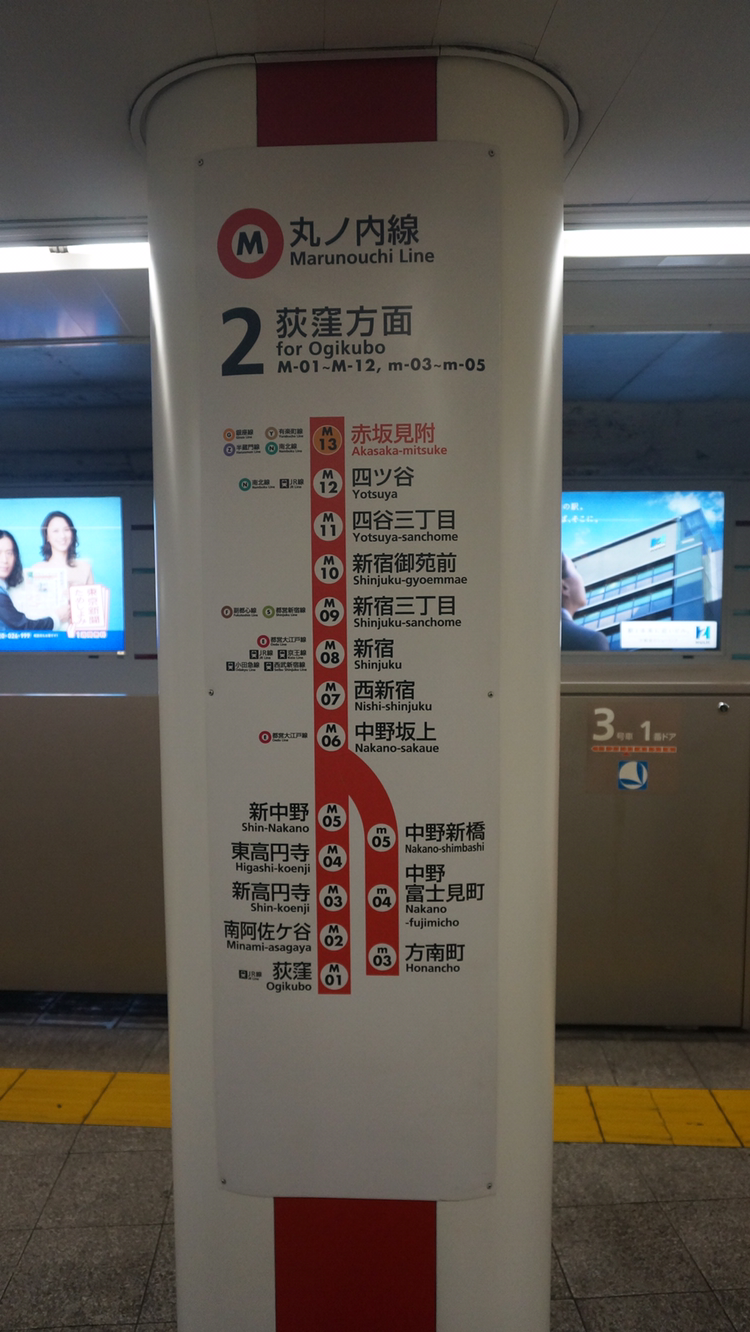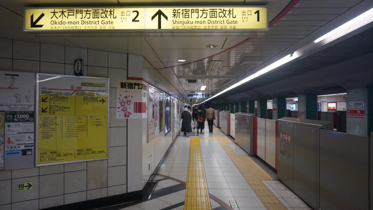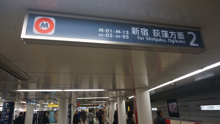 신바시역에서 시부야행 긴자선을 타고 가다가 아카사카미쓰케역에서 오기쿠보행 마루노우치선으로 갈아타고 숙소가 있는 신주쿠교엔마에역에서 하차