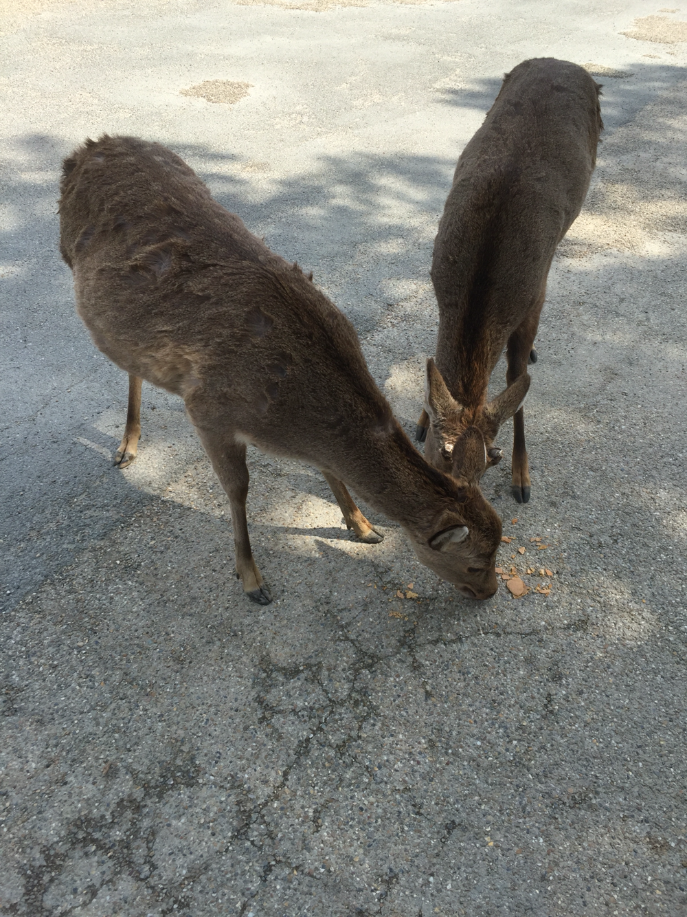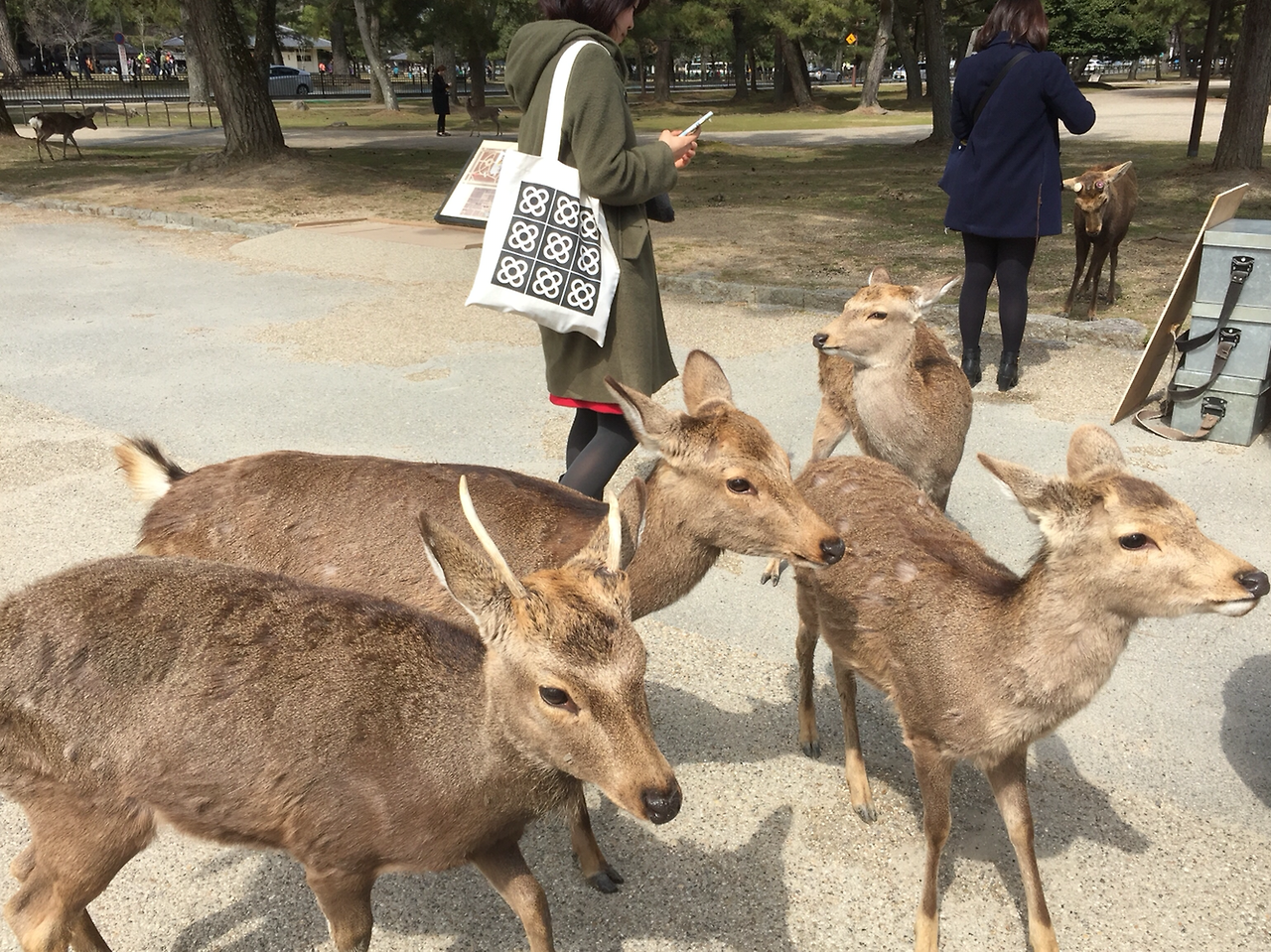 전날 낮에 사진을 못 찍어서 역으로 가는 길에 다시 한 번 나라 공원을 들렀다~! 해가 좋아서인지 많은 사슴들이 길을 거닐고 있었고 아이들에게 줄 간식을 150엔에 사서 후하게 하나씩 챙겨주다가 막판에 욕심 많은 친구한테 한꺼번에 4개를 강탈당했다~!