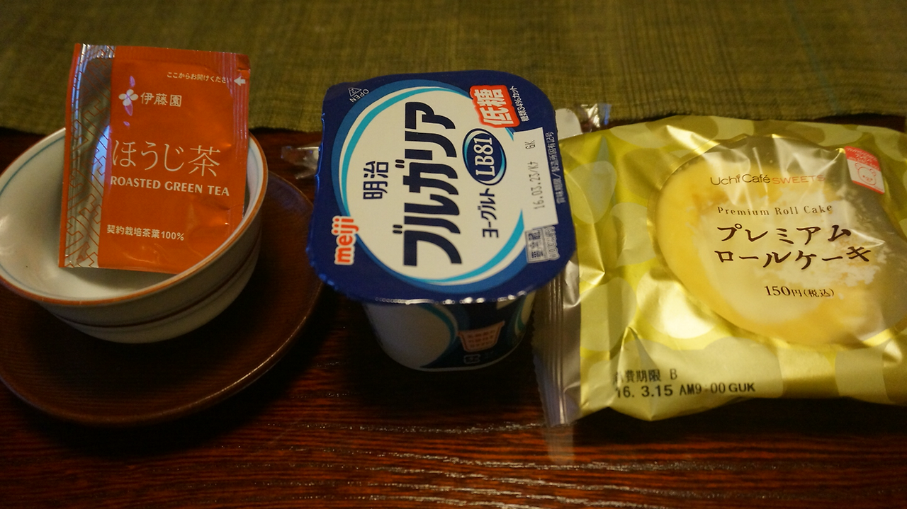 얼마 후 남자 직원이 웰컴 티를 가지고 와 한잔을 마시고 저녁은 6시에 먹기로 이야기한 다음 그 사이에 나라 로손 편의점에서 구매한 크림빵이랑 그릭 요거트, 녹차 한 잔을 해치웠다!