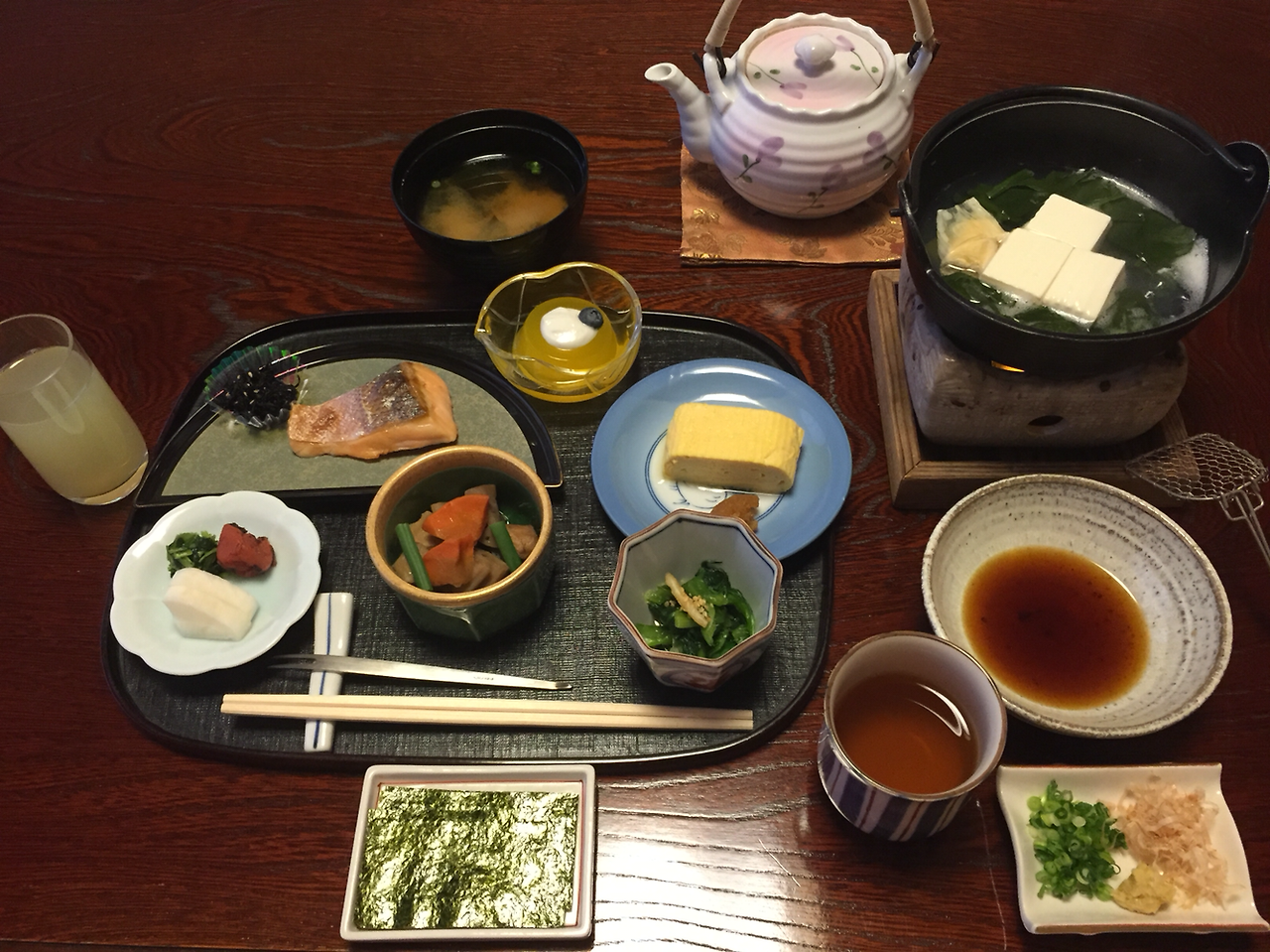 식전 주스를 먼저 한 잔 한 다음 본격적으로 식사를 시작했는데 연어 구이도 맛있고 역시나 우매보시는 그 시큼한 맛이 입맛을 돋운다! 봐서 여행 일정 말미에 우메보시 몇 종류 사가야 할 듯싶다!