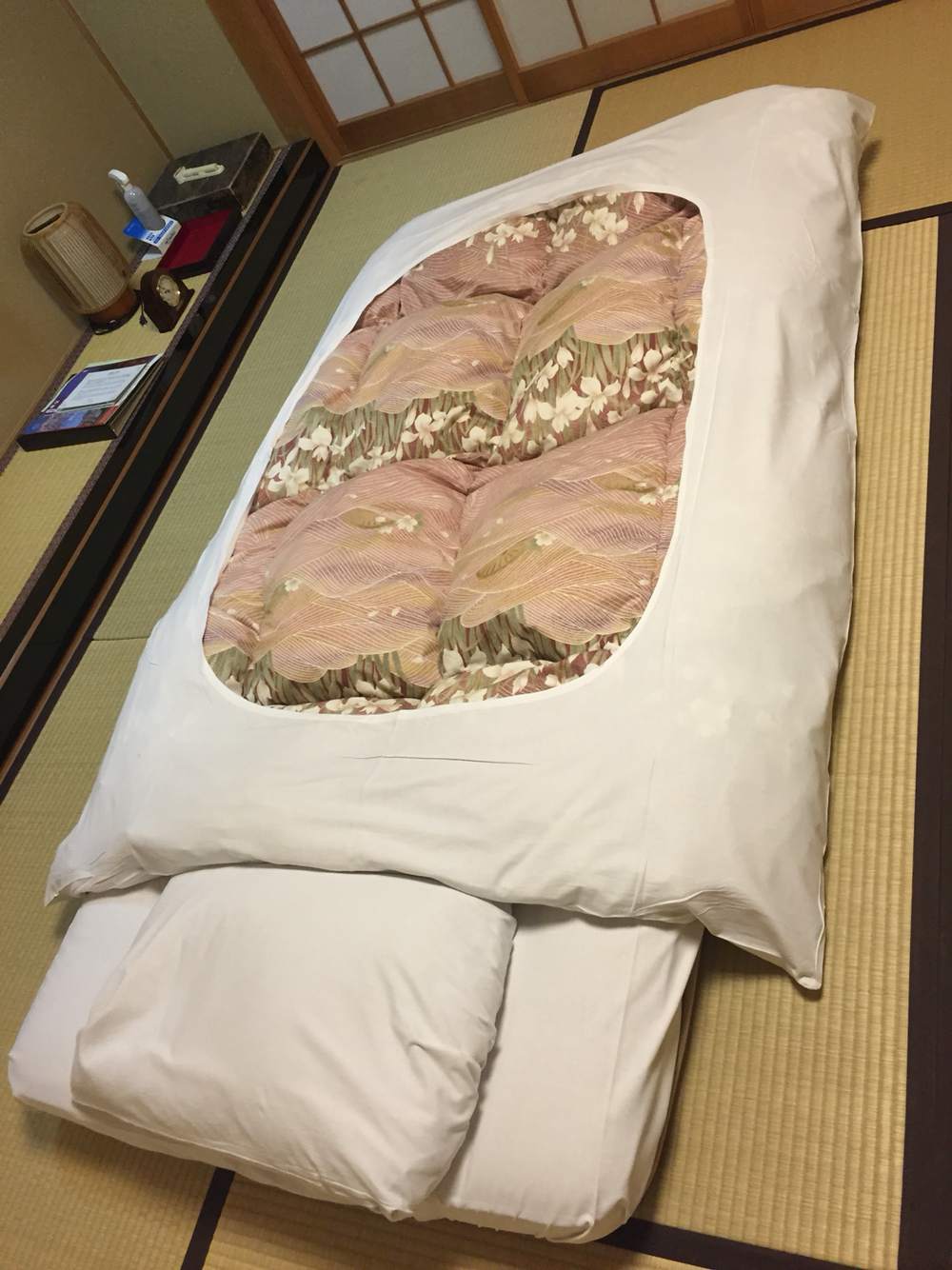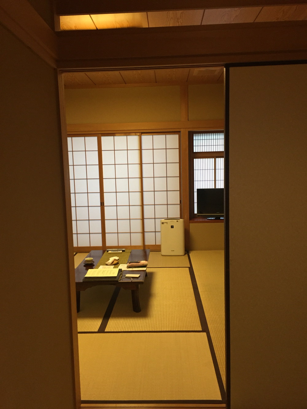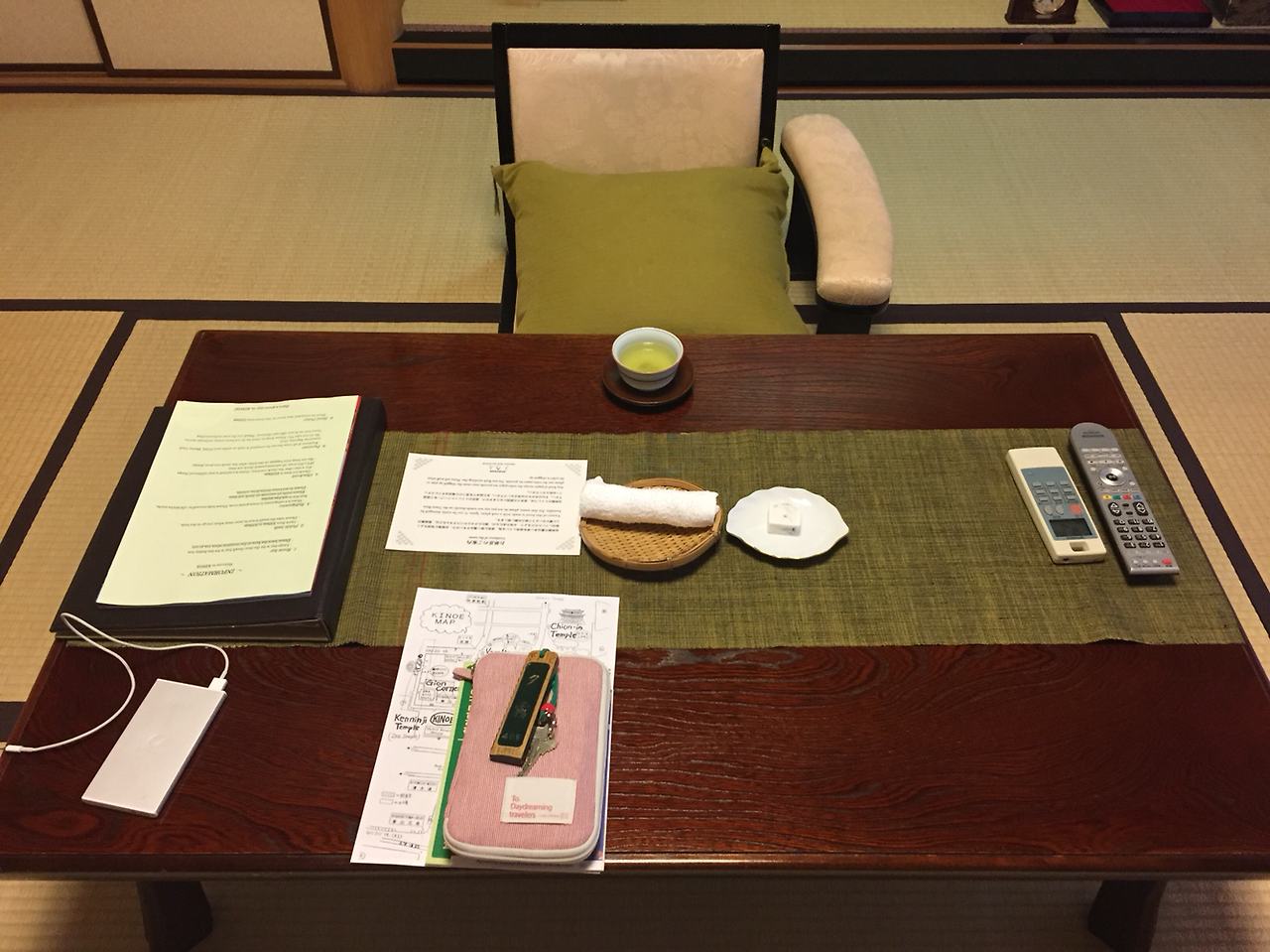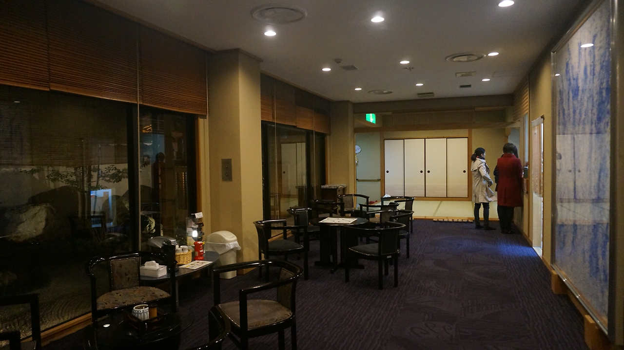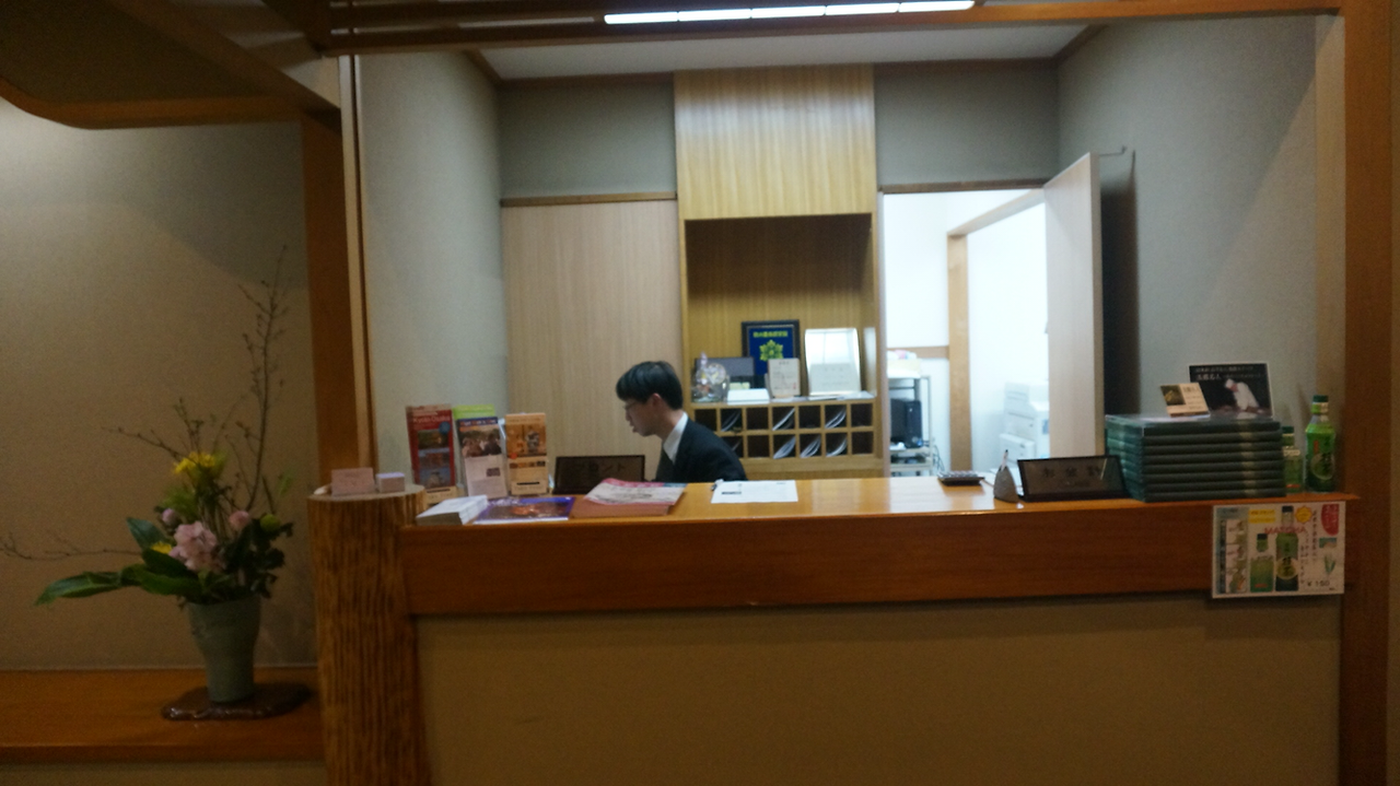 문을 열고 들어가 수속을 밟고 남자 직원이 알려주는 자세한 도시 안내까지 받고 다다미 객실에 들어왔다!