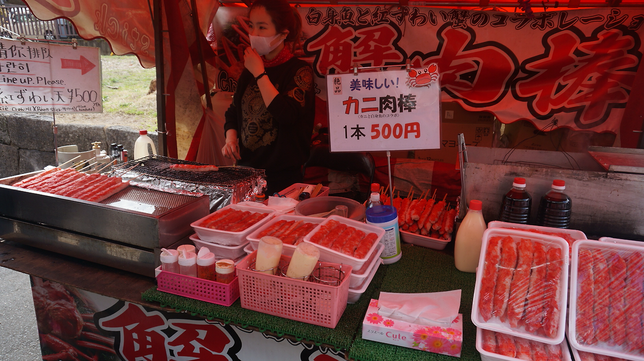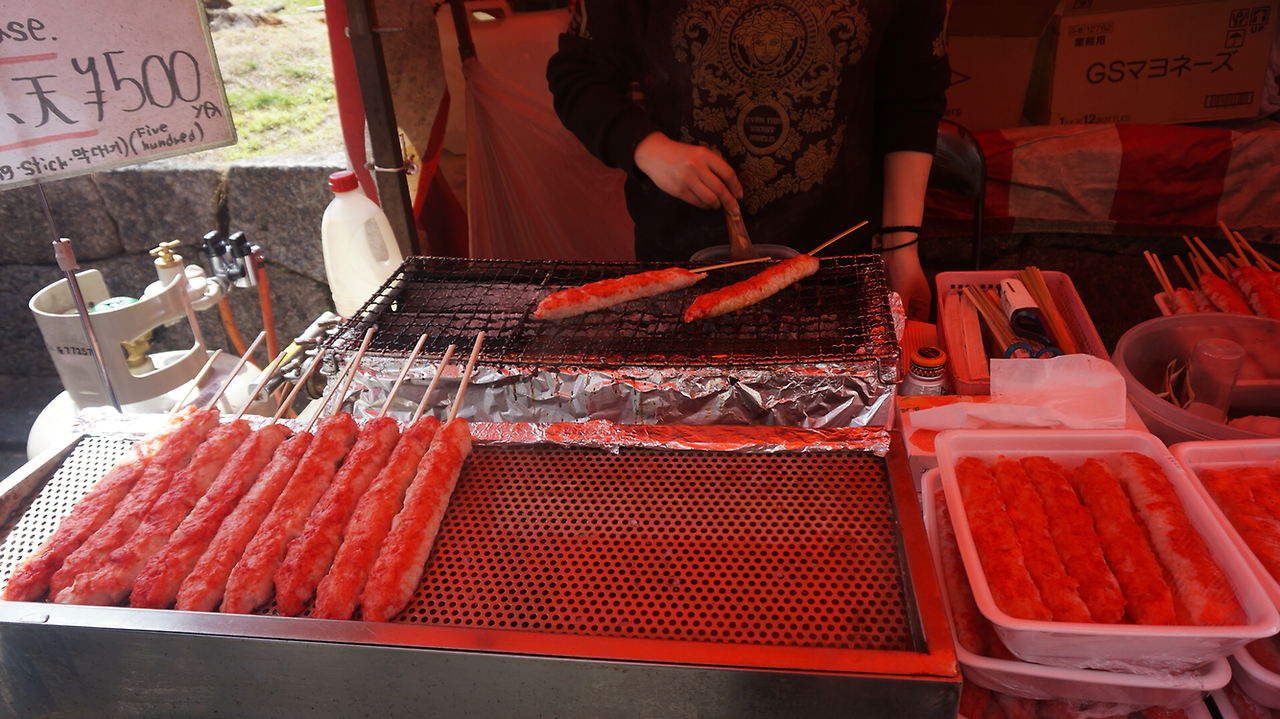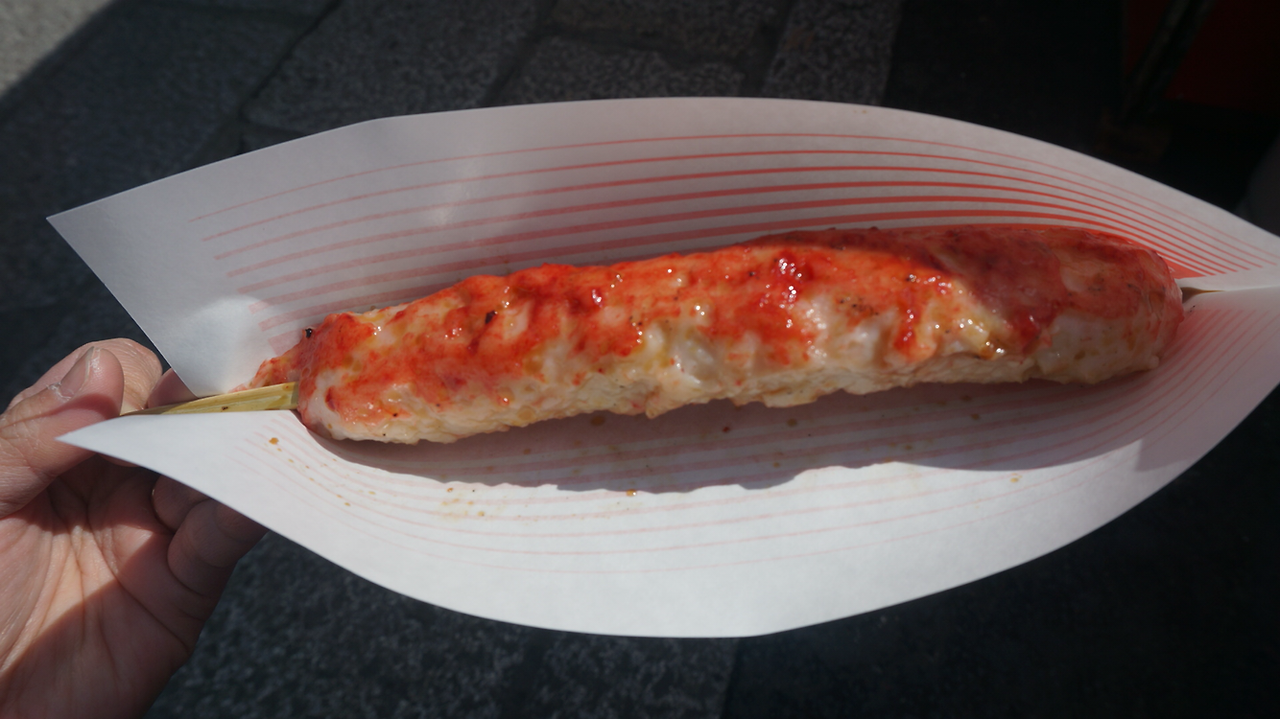 올라가기 전에 양쪽으로 늘어선 포장마차 중에서 메뉴를 하나 골라 간식 한 번 맛봐주시고! 통 게살을 구운 다음 참기름을 발라주는데 가격은 500엔