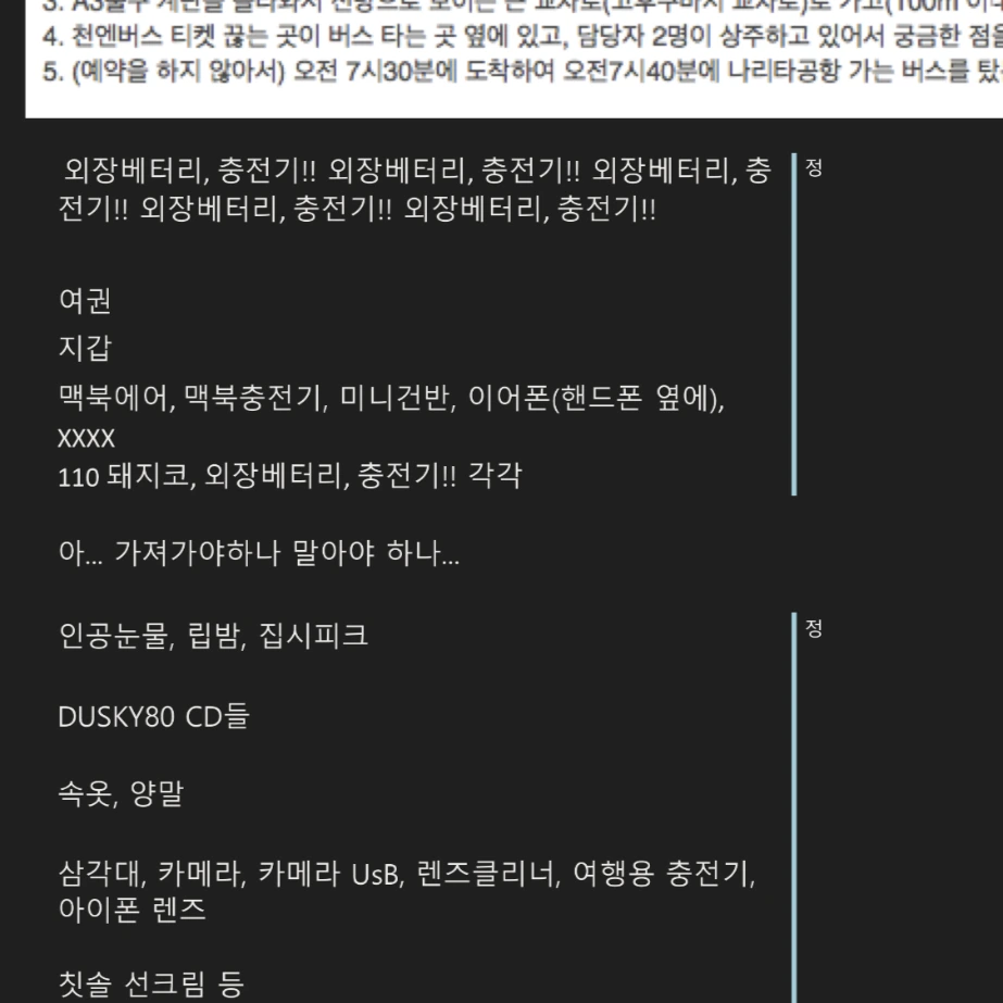 원래 여행을 가기 전 미리미리 짐을 싸 두는 성실한 성격이 전혀 아닌 나는 그래도 최소한 잊어먹고 가는 건 없었으면 하는 바람으로 가져가야 할 물건들을 생각날 때마다 이렇게 노트에 아무렇게나 타이핑해 놓고 나중에 짐을 꾸리면서 하나하나 체크하곤 한다. 거의 여행 가는 날이 되어서야 헐레벌떡 짐을 싸는 게으른 성격이기 때문에 이렇게라도 해두지 않으면 높은 확률로 필요한 물건을 빼먹고 출발하게 되기 때문이다.