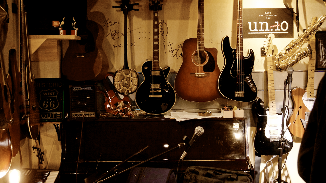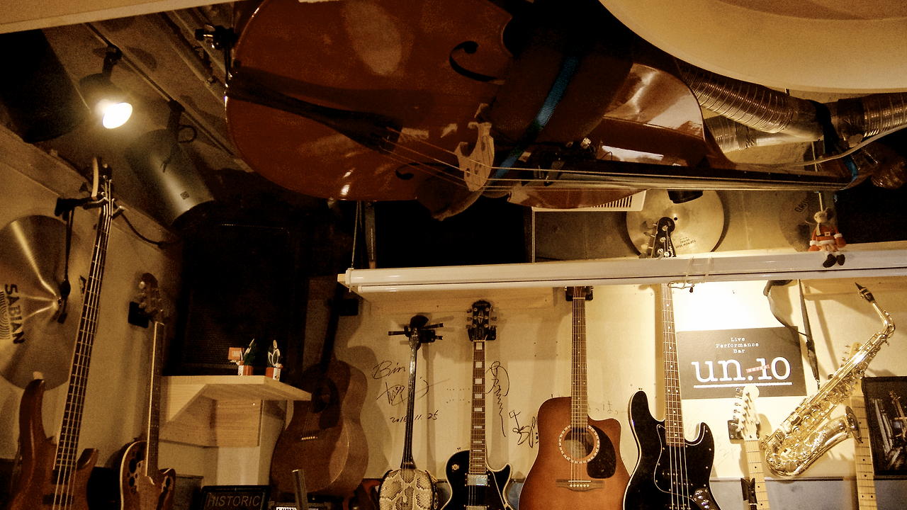 Bar un.10에 들어서면서 가장 인상적이었던 것은 바로 비좁은 무대 천정에 아찔하게 걸려있는 콘트라베이스의 모습이었다. 그리고 '저걸 정말로 사용하긴 하는 걸까?' 하는 의심도 잠시, 베이스 연주를 위해 천정에 로프로 단단히 고정되어있는 콘트라베이스를 끄집어 내리는 모습을 보며 '우와'하는 탄성을 지를 수밖에 없었다.