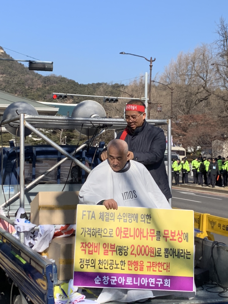 아로니아 역시 수입산으로 피해를 봤지만 피해보전대상이 되지 못했다. 아로니아는 생과가 수입되지 않기 때문이다. 가공품(분말)으로 인해 가격이 하락한 것을 보전해 줄 수 없다는 것이 농식품부의 주장이다. 아로니아 재배농가들은 지난해 10월부터 집단행동에 돌입했다. 국감장에서 기자회견을 하고 세종 정부청사에서 집회도 하고 결국 청와대 앞에서 삭발을 했다.