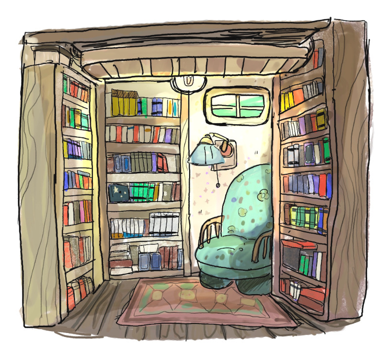 그의 집은 선반마다 각양각색의 책들로 빼곡히 가득하다.