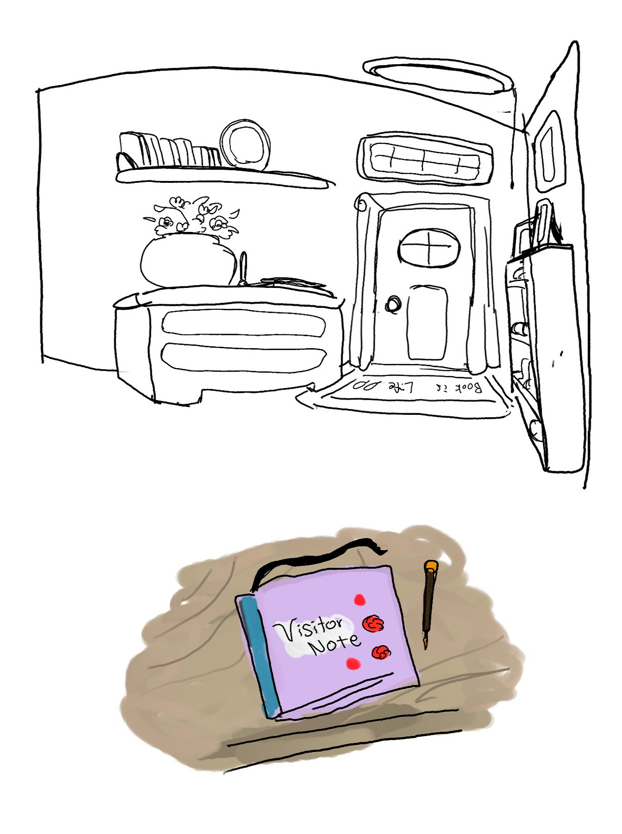 출입구에는 방문자 기록 책이 빼곡히 꽂혀 있고