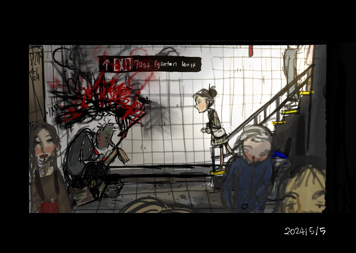 빠르게 움직이는 그의 손은 확실히 예술을 하고 있었다. 적어도 나의 눈엔 그렇게 보였다. 열정 가득한, 어린 미술가였던 나는 지하철에서도 미술 생각이 가득했기 때문에 종이와 펜만 보면 그림 생각이 나 두근거리곤 했다. 그냥 지나치려 했지만, 눈에 너무 밟혔다. 그의 마약 냄새와 열정이 너무 반대돼서, 나와 다른 세계라서, 그의 미술이 더 궁금했다. 박스에 그려낸 빨강과 검정의 미술을 보고 싶었다. 내가 소중한 기회를 놓치는 게 아닐까 너무 아쉬웠다.