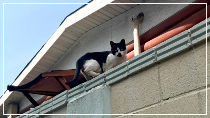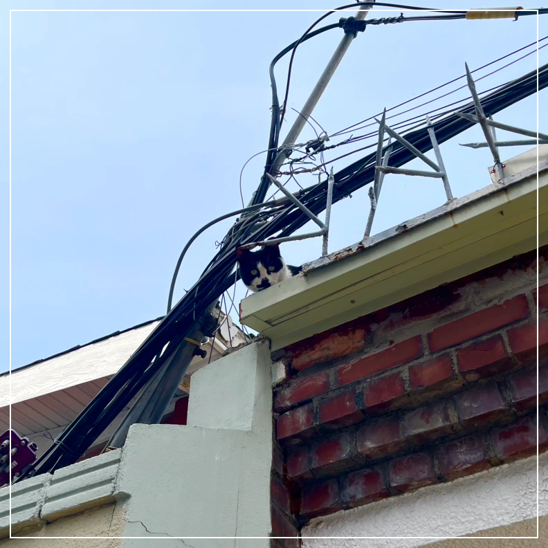 내 키보다 높은 담벼락 위, 전봇대에 반쯤 가려진 고양이 한 마리가 보였다.