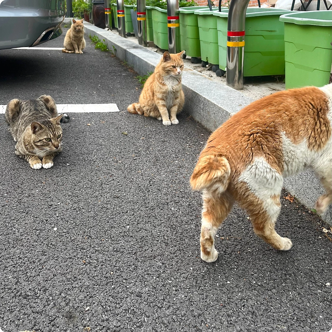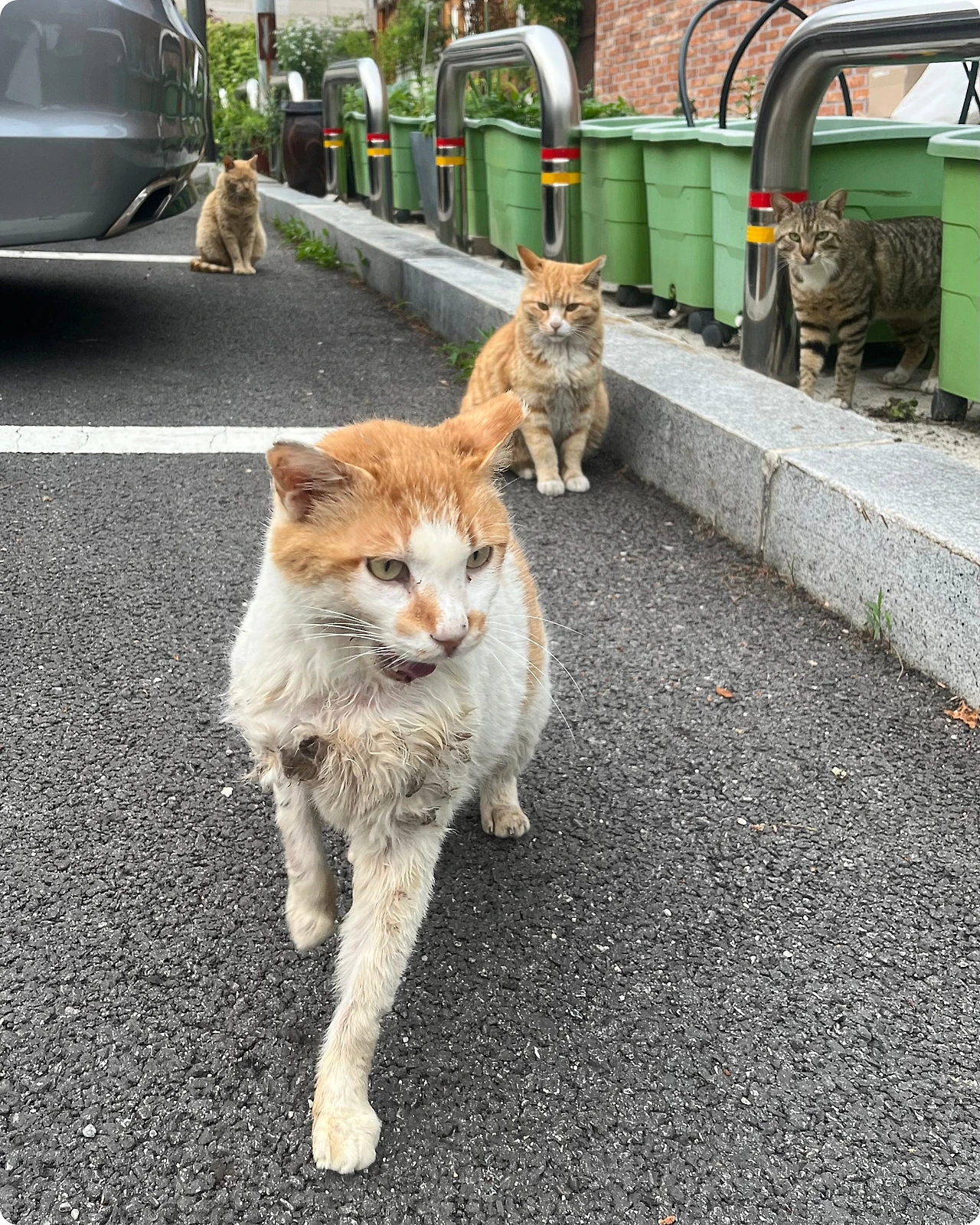 윗마을을 가보니, 어느 주차장에 고양이 네 마리가 살고 있었습니다.