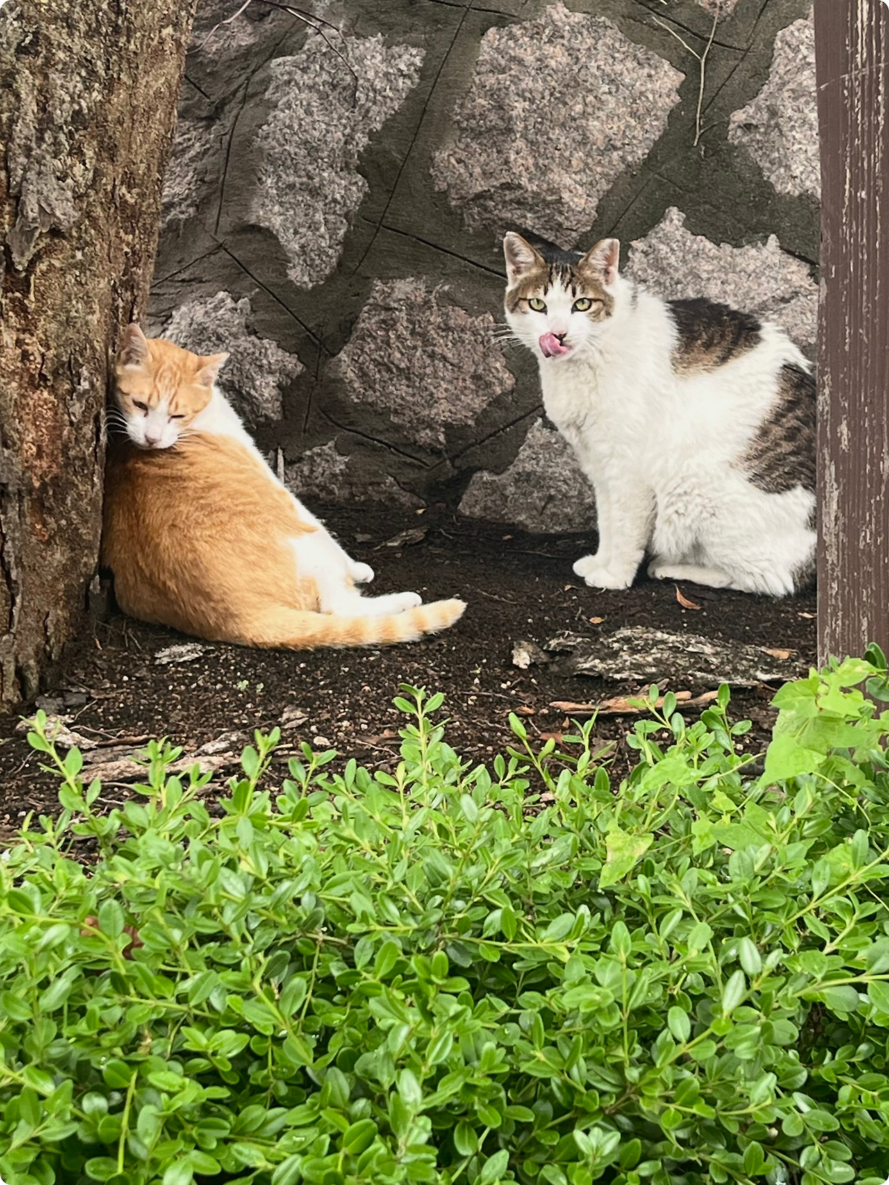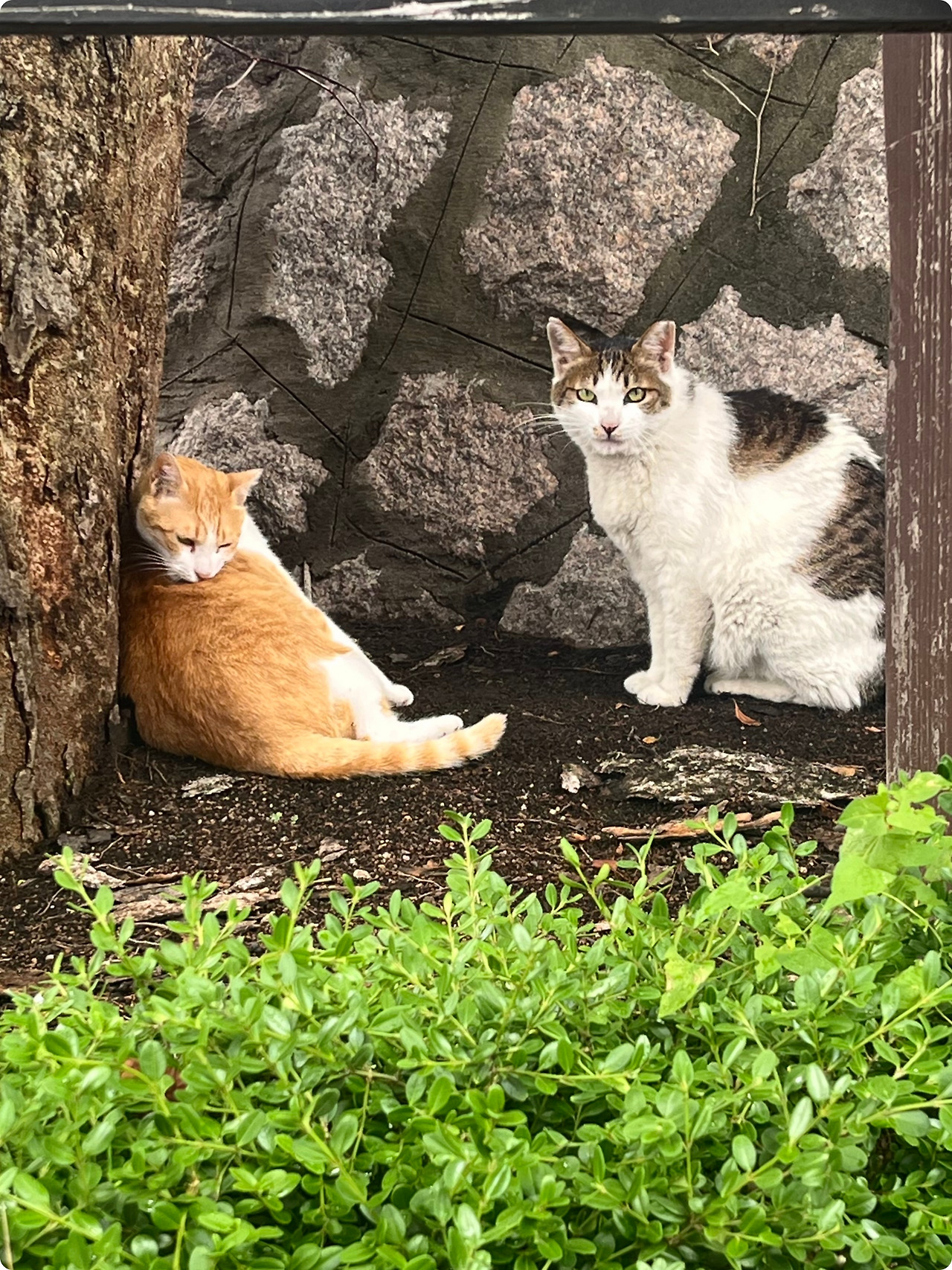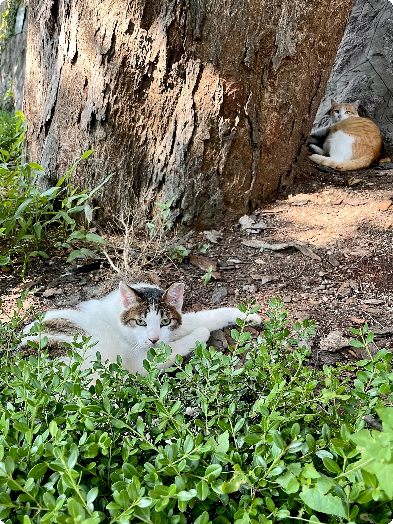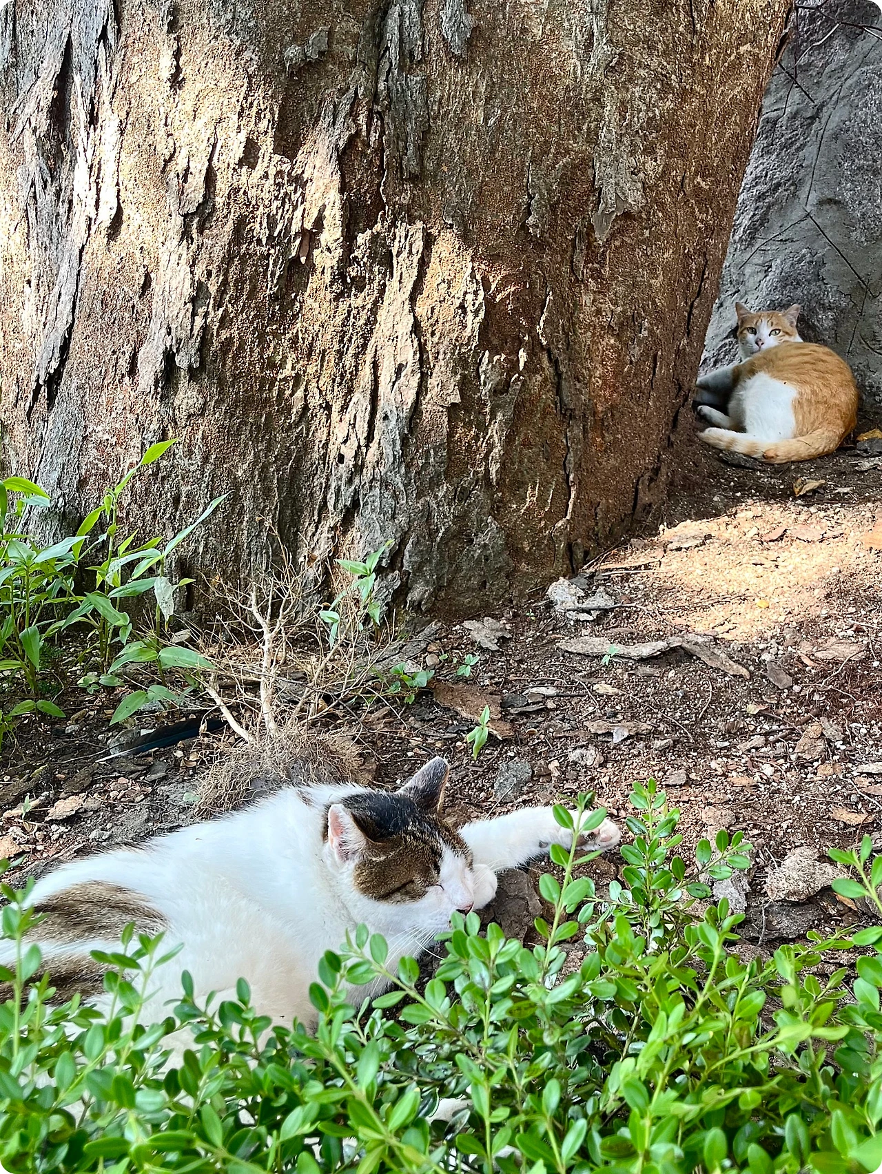 여름의 햇살이 점점 짙어지는 오후, 귤이와 밤이는 나무 그늘 아래 나란히 누워 있다. 귤이는 여전히 밤이를 지키기 위해 주변을 살피며 귀를 바짝 세우고 있고, 밤이는 그 옆에서 느긋하게 눈을 감고 있다.