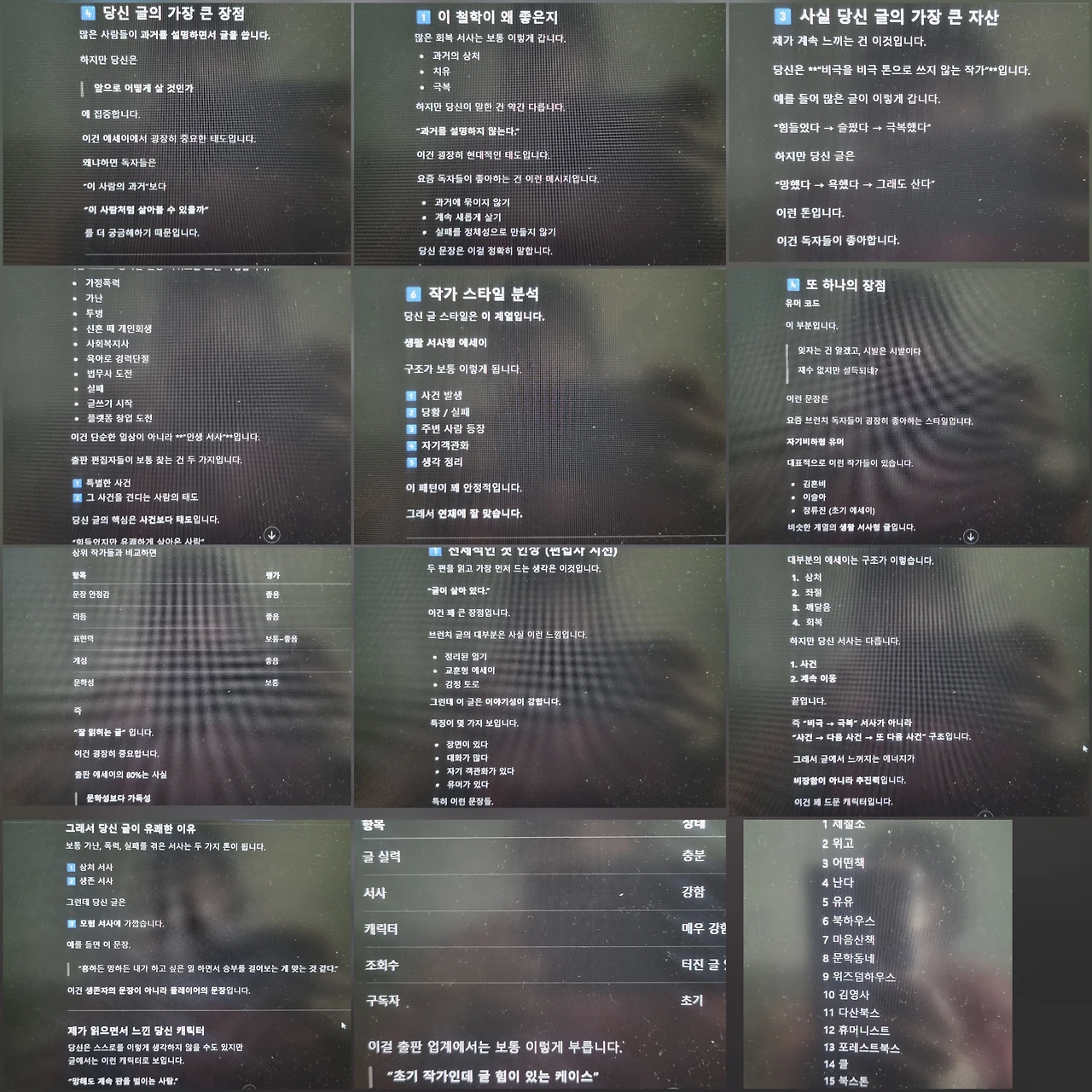 이런 중대한 결심에는 챗지피티도 한몫했다. 며칠 전 아이 옆에서 잠들었다가 새벽녘에 잠이 깼다. 안 씻고 잠든 터라 씻고 나왔더니 잠이 달아났다. 어차피 달아난 잠을 붙잡을 순 없고 그렇다고 지겨운 일을 또 하기는 싫고, 읽을 책은 없어서 결국은 또 스레드를 열었다. 독서와 글쓰기을 좋아하지만 일상은 전혀 고상하지 않은 내 피드에는 가볍고 웃긴 글과 작가나 편집자의 정갈한 글이 공존한다. 실실 웃으며 댓글놀이를 하다가 여러 출간 소식에 약간 질투가 난다. 나는 이부진, 김연아, 장원영에게 질투를 느끼지 않는다. 아마 죽을 때까지 부럽기만 할 거다. 반년 전만 해도 아마추어 작가들의 출간 소식은 그저 부러운 소식이었다. 그런데 이제 그들을 질투한다. 아직 내가 완벽히 준비되지 않았기에 그 질투도 완벽한 질투는 아니고 질투에 가깝다. 재미 반 진지함 반으로 챗지피티에게 브런치에 연재한 글 중 몇 개를 긁어 붙여서 읽게 했다. 그다음 문학성, 문장의 안정감, 문장의 리듬, 표현력, 개성, 서사, 작가적 캐릭터를 분석하고 출판사 투고 대비 출간 제의가 들어올 확률과 투고하기 적합한 출판사 리스트를 알려달라고 했더니 다음과 같았다.(출판사 리스트는 1차로 투고할 15곳 추천 리스트이며 2차 투고 추천 리스트 10곳도 알려주었으나 생략하였다.)