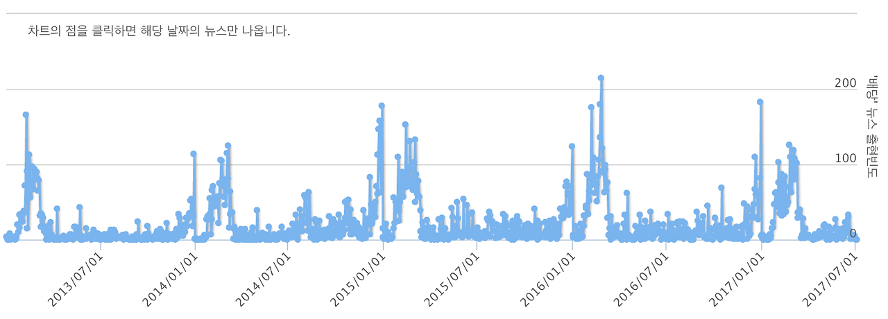 자 그럼 2월, 3월 4월에 대해서 이야기를 해보도록 합시다. 배당주의 연중 사이클을 이해하기 위해서 두 종류의 데이터를 살펴볼텐데요 첫번째는 '배당'과 관련된 뉴스의 빈도입니다.