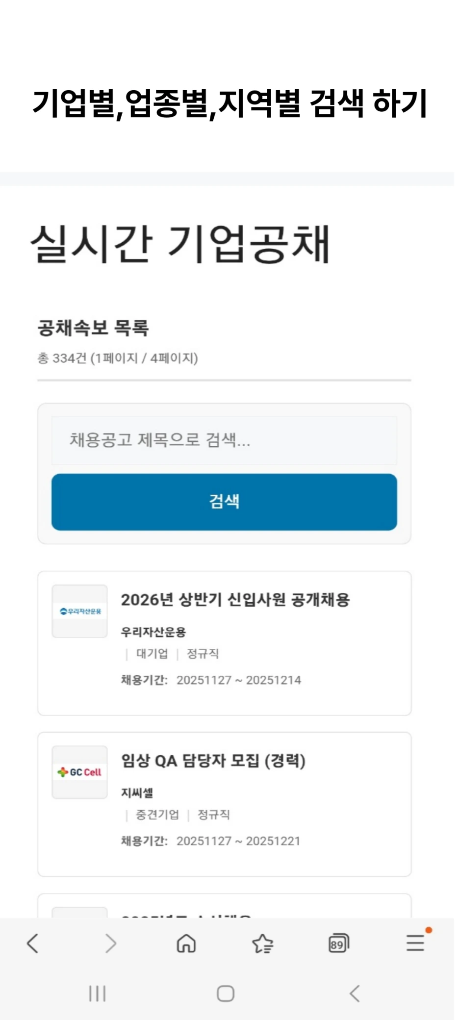 내가 직접 찾으러 다니지 않아도 됩니다. 새로운 기업 공채, 대기업/공기업 소식이 업데이트되는 즉시 휴대폰으로 **[알림]**을 보내드립니다.