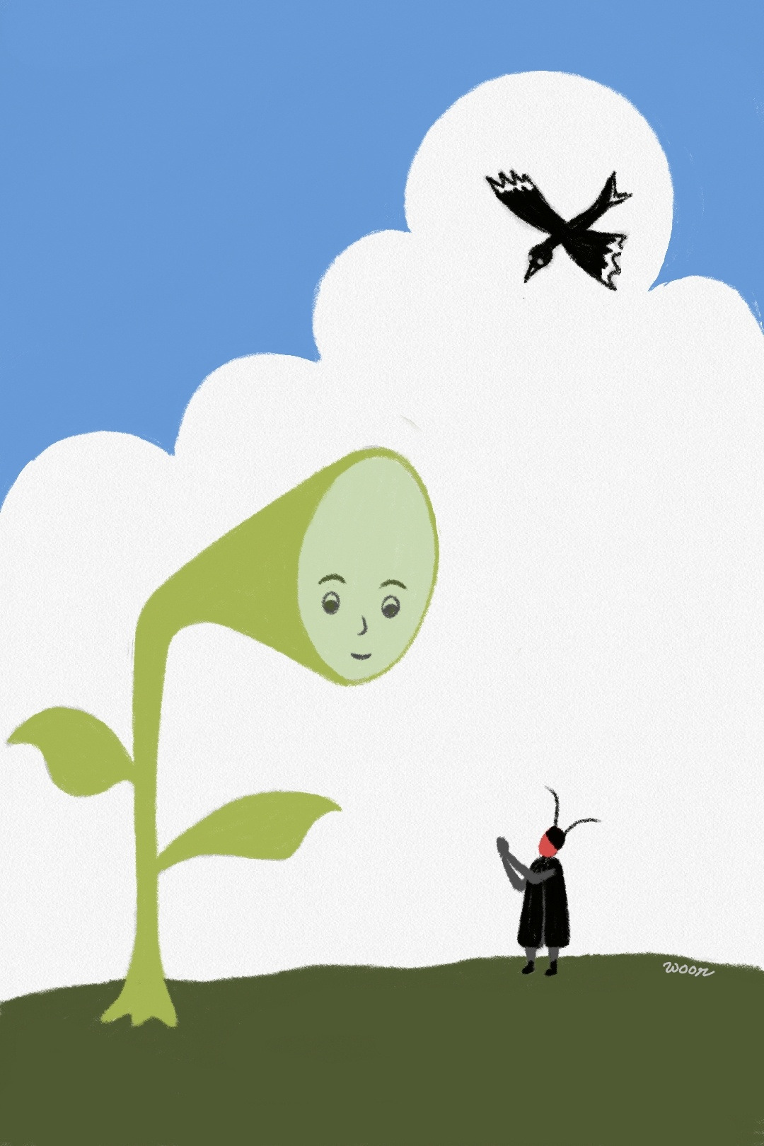 얼마 있자, 정말 개똥벌레의 말처럼 새가 날아와 식충이 주위를 둘러보기 시작했어요.