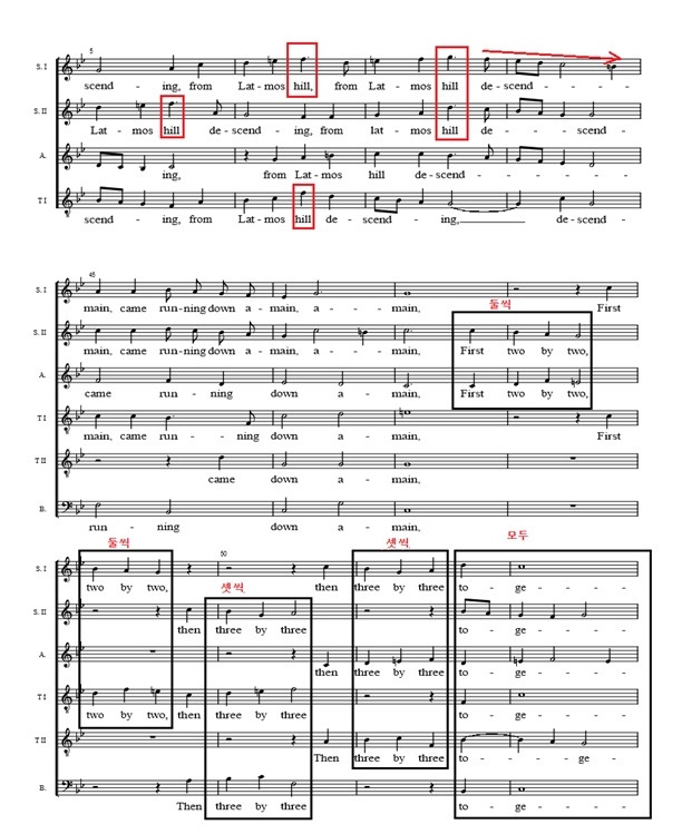 기독교 중심 세계관에서 인간 중심의 세계관으로 변화는, 신을 찬양하는 음악에서 인간이 즐길 수 있는 음악의 발전으로 이어졌고, 그 변화의 중심에 마드리갈이 있었다. 초기 이탈리아를 중심으로 발전하던 마드리갈은 이탈리아 음악가들이 유럽 각지에서 활동함으로써 확산된다. 16세기 중반에 마드리갈은 영국에서도 크게 유행하였다. 23명 작곡가의 25곡이 수록된 『오리아나의 승리』(The Triumphes of Oriana 1601)는 영국의 대표적인 마드리갈 선곡 집이다. 이 선곡집 중에 토마스 윌크스(T. Weelkes, 1575-1623)의 〈라트모스 언덕에서 베스타 여신이 내려올 때〉(As Vesta was from Latmos Hill descending)는 작곡가의 재치가 돋보이는 마드리갈이다. 예를 들어, 가사 ‘언던’(hill)은 높은 음역 대의 음으로, ‘내려가는’(descending)은 높은음에서 낮은음으로 진행하고, ‘올라가는’(ascending)은 상행하는 선율로, ‘뛰어 내려가다’(running down)은 당연히 하행하는 선율로, ‘둘씩’(two by two)는 성악가 둘이 노래하고, ‘셋씩’(three by three)은 성악가 세 명이 노래하고, ‘모두’(together)는 여섯 명 모두를 노래하고, ‘만수무강하소서 오리아나’(Long live fair Oriana)는 각각의 성부에서 군중이 만세를 외치는 것처럼 작곡했다. ♫
