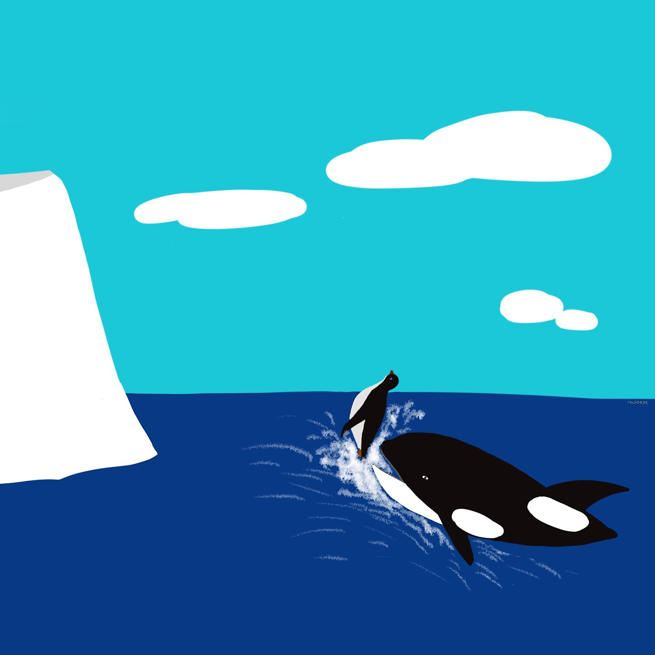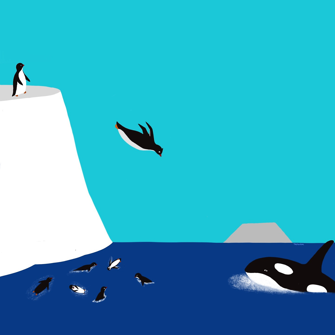 아빠 펭귄의 소리에 놀라 뒤를 돌아본 어린 펭귄들은 범고래를 보고 도망을 쳤다. 그러나 범고래는 너무 빨랐고, 펭귄들은 피할 수 없었다.