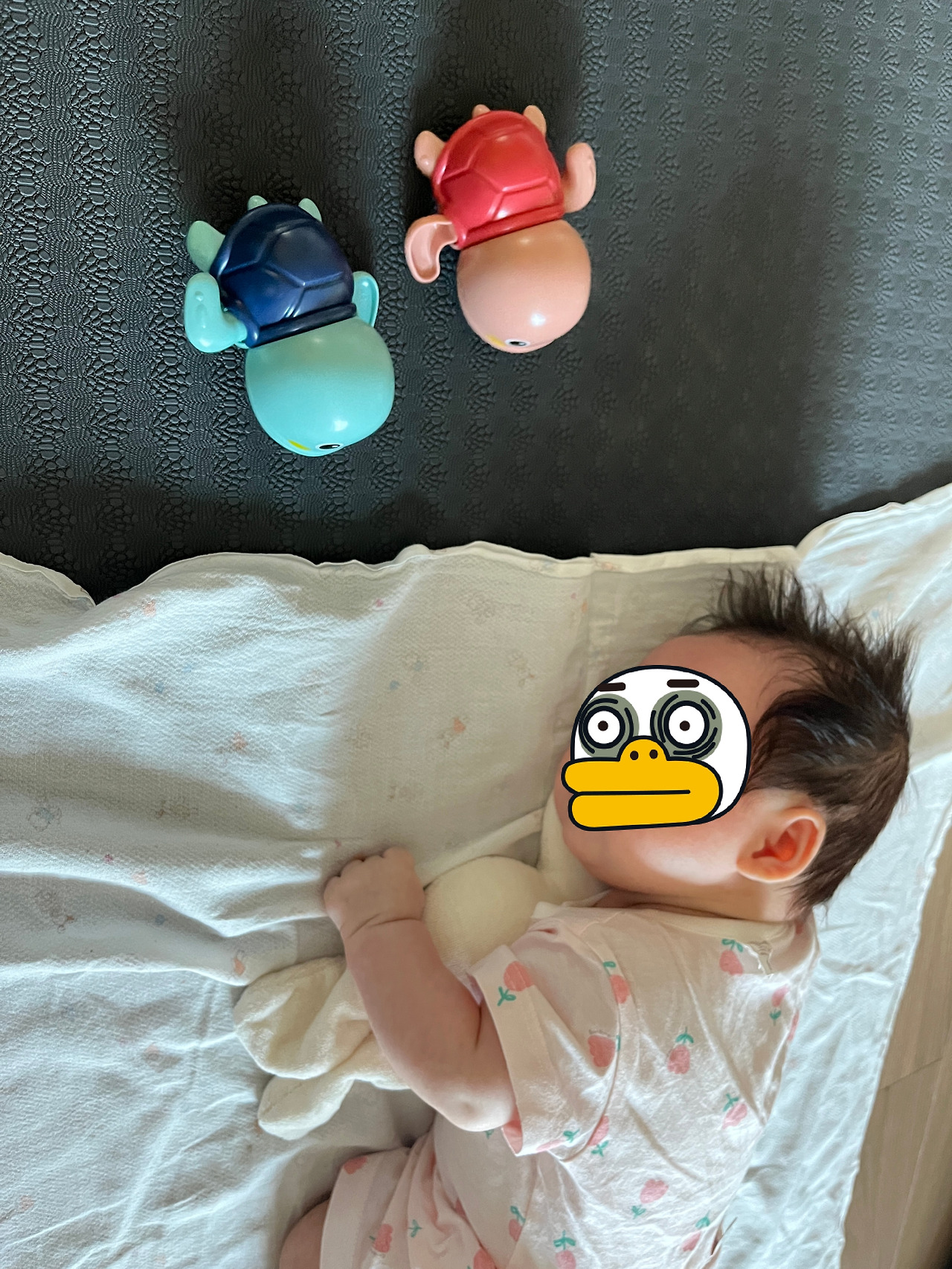 이런 행복도 잠시 나는 사악한 남흑막으로부터 보복을 당하게 되었다. 남흑막은 피곤한 자신과 달리 내가 활기차게 목을 가누는 것을 보곤 탐탁지 않았던 듯싶다. 남흑막은 나를 번쩍 들더니 그대로 든 채로 누워버렸다. 그런 다음 자신의 커다란 똥배 위에 나를 엎드린 자세로 엎어두었다. 남흑막은 복수를 할 수 있다는 희열 때문인지 격앙된 목소리로 "터미 타임~"이라고 소리 질렀다. 이때 이후 나는 '터미 타임'이라는 단어가 나를 고문하는 시간이라는 것을 알게 되었다.
