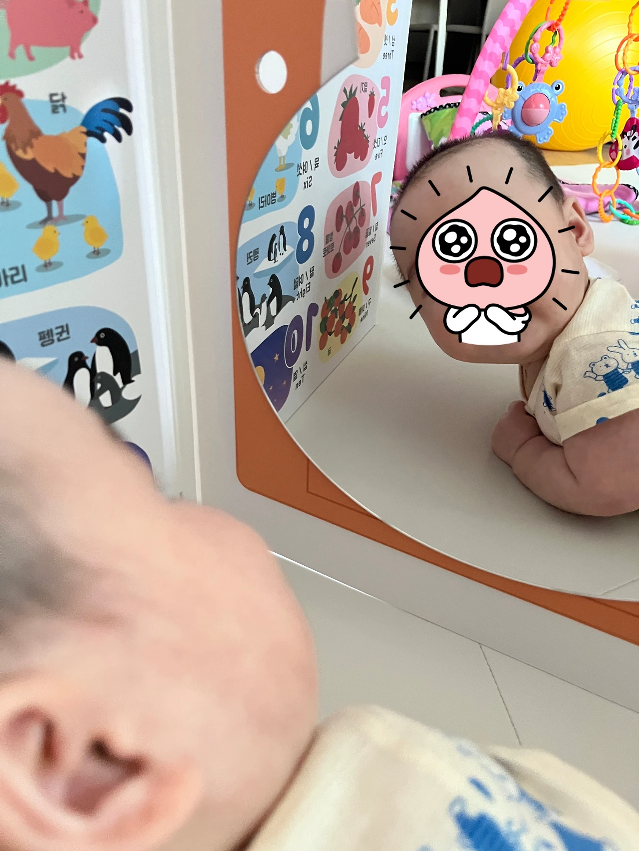 특히 벽의 한 면 중에는 놀라운 게 있었다. 그 면 너머에 이상하게 생긴 생물이 막 움직였다. 그 생물은 내가 보던 나의 자그마한 손도 가지고 있었고 토실토실한 발도 있었다. '나 말고 여기에 갇힌 사람이 있었나?' 난 한 번도 다른 사람을 이때까지 본 적도 없었고 나의 울음 말고 다른 울음소리를 들어 본 적도 없어 나 혼자만 여기에 갇혀 있는 줄 알았다. 벽 너머에 있는 사람도 내가 신기한지 내가 볼 때면 언제나 나를 보고 있었다. 항상 나를 보고 있는 것을 보니 내가 그를 보는 것보다 더 많이 나를 지켜보는 것 같았다.