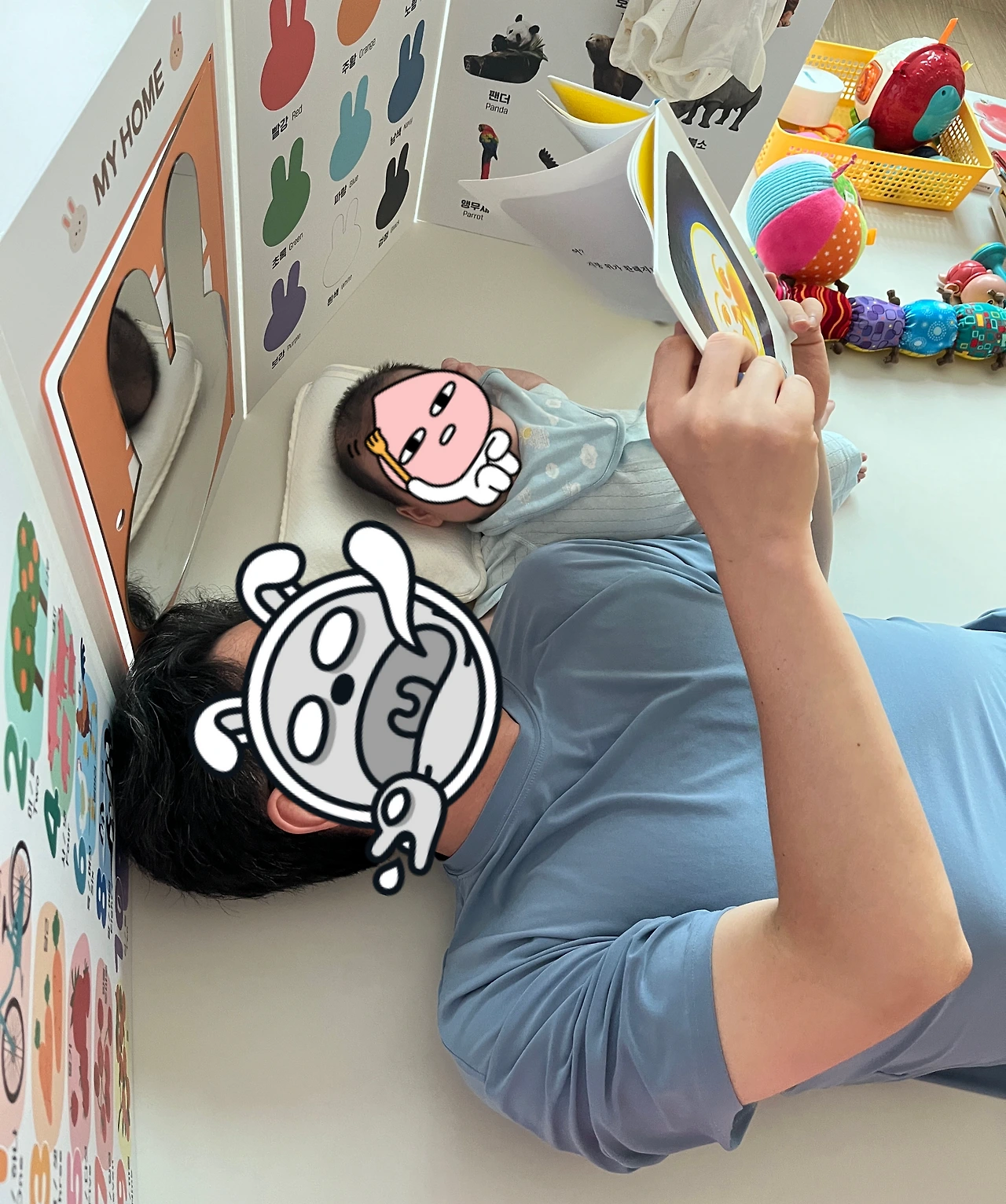 어느 날 남흑막이 은근슬쩍 운동으로 지친 내 옆으로 왔다. 그의 손에는 판 위에 올려두었던 종이로 된 것이 쥐어져 있었다. 남흑막은 나의 머리와 남흑막의 머리가 나란히 되도록 누웠다. 그리고는 종이로 된 것을 나에게 보여줬다. 남흑막은 노르스름하고 둥그런 모양을 가리키며 "달님 달님, 달님 이야기"라고 나에게 하나하나 주지시키듯 천천히 또박또박 이야기했다. 종이를 넘기니 검은색과 하얀 문양이 있었고 남흑막은 "고양이 고양이"라고 또 나에게 이야기했다.