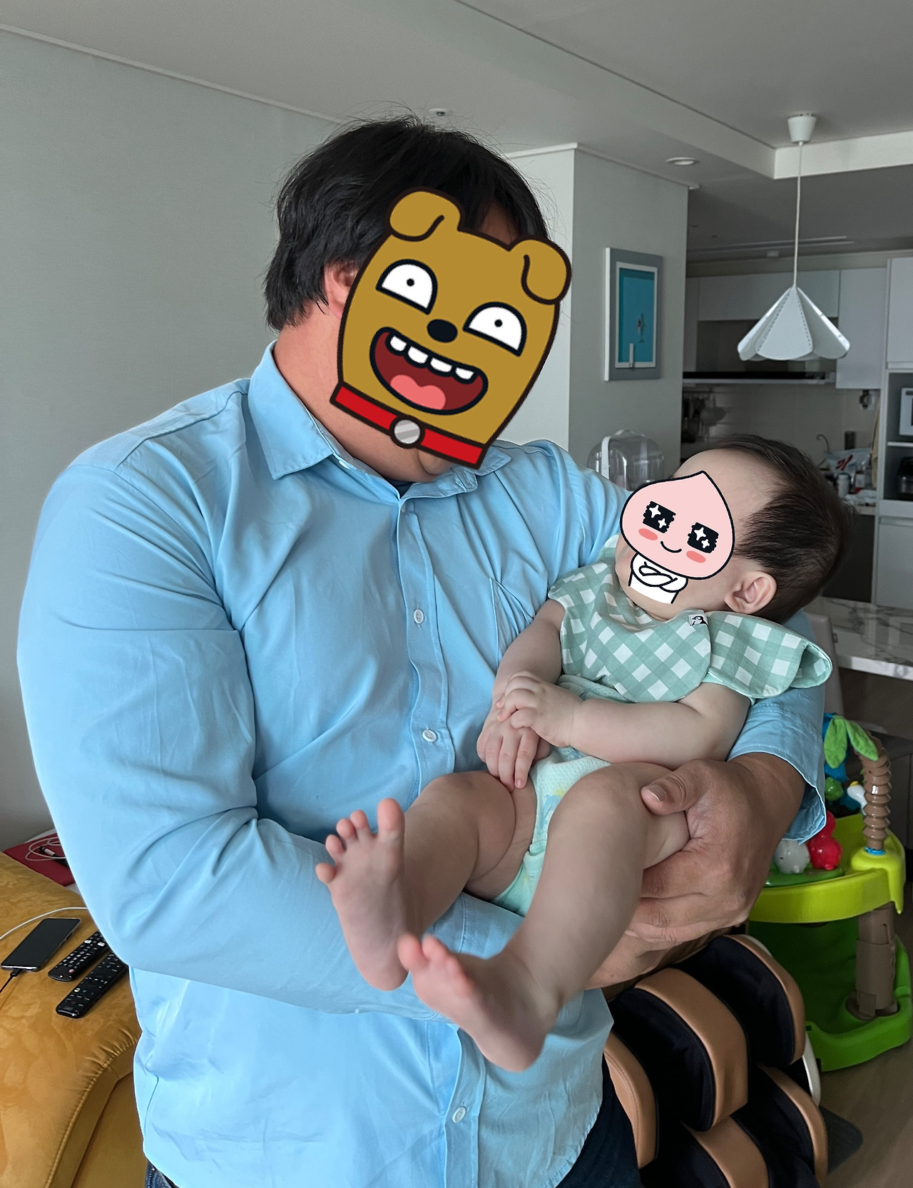 무서웠던 첫인상의 삼촌은 내가 좋은지 환하게 웃었다. 내가 무겁지도 않은지 두꺼운 팔로 들었다 내렸다 하거나 옆으로 힘차게 흔들었다. 삼촌의 품은 여흑막의 포근함과 남흑막의 즐거움이 같이 있었다. 또한 나를 향해 이상한 소리도 냈다. "까꿍 까궁" 긴장으로 뻣뻣했던 나는 어느새 즐거워져 방긋 웃고 있었다.