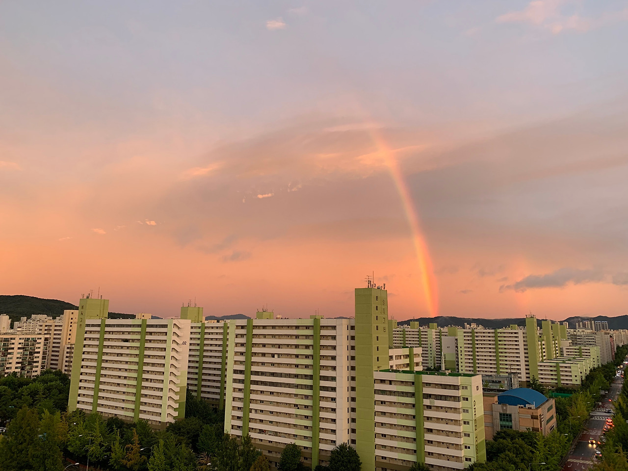 길 건너 아파트 뒤로 무지개가 보였다.