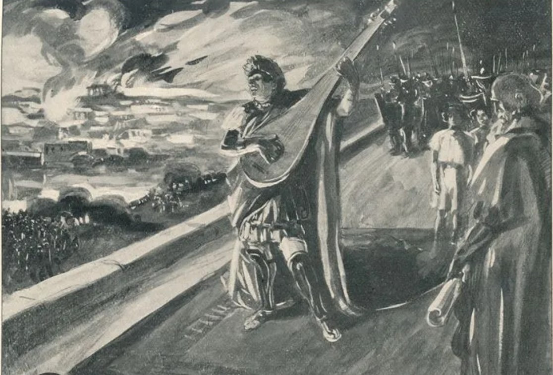 황제 즉위 10주년 되는 AD 64년, 축하 세리마니로 로마가 화염에 휩싸인다. 열넷 행정구역 대부분이 5일 만에 파괴되는 대화재다. 팔라티누스 언덕에 올라 타오르는 화염을 바라보며 네로는 스스로 광기를 솟구치게 한다. 언덕은 남산처럼 로마 중심에 있고 불꽃은 악마처럼 네로 심중에 있다. 언덕에 서서 광염의 소나타를 연상한다. 가락이 떠오르지 않자 수금을 뜯는다.