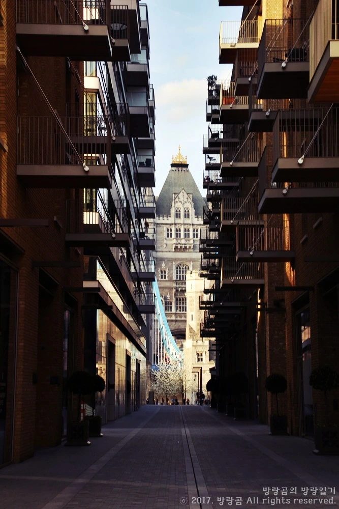 골목길 사이로 보이는 타워 브릿지의 주탑