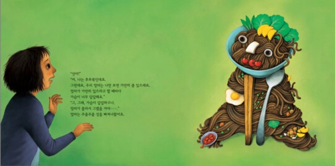 짜장나라에 도착하여만난 국수 아이 후루룩은 엄마가 가만히 있으라고 하면 가슴이 답답하다고 했다.