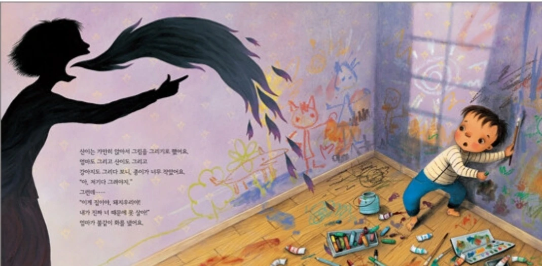 표지에 그림자만 나온 엄마는화가나 있다. 어찌나 화가 났는지 한 올 한 올 머리카락 끝까지 화가보인다. 애가 어땠길래 저렇게 화가 났을까. 아이는 화 난 엄마를 보고 있다. 그림자도 무서운데실제엄마 얼굴은 어떨까? 겁의 질린 아이의 시선의 끝에 내가 있다. 바로 내가 그 화내는 엄마이다.