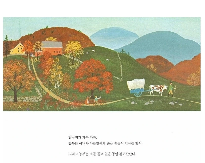 가족들의 일 년이 담긴 달구지를 끌고 시장을 향했던 농부의 마음을 생각해 본다. 소와 달구지 가져간 모든 것을 팔고 난 후 가족을 위한 물건을 사서 돌아오는 농부의 마음을 생각해 본다. 달구지를 끌고 시장에 다녀오는 이십여 일간의 농부 여정, 집에서 농부를 기다리는 동안 가족들은 어떤 마음으로 아빠를 기다렸을까? 나는 아이의 말소리를 따라 책장을 넘기며 그림책 속 남은 빈 공간을 채워본다.