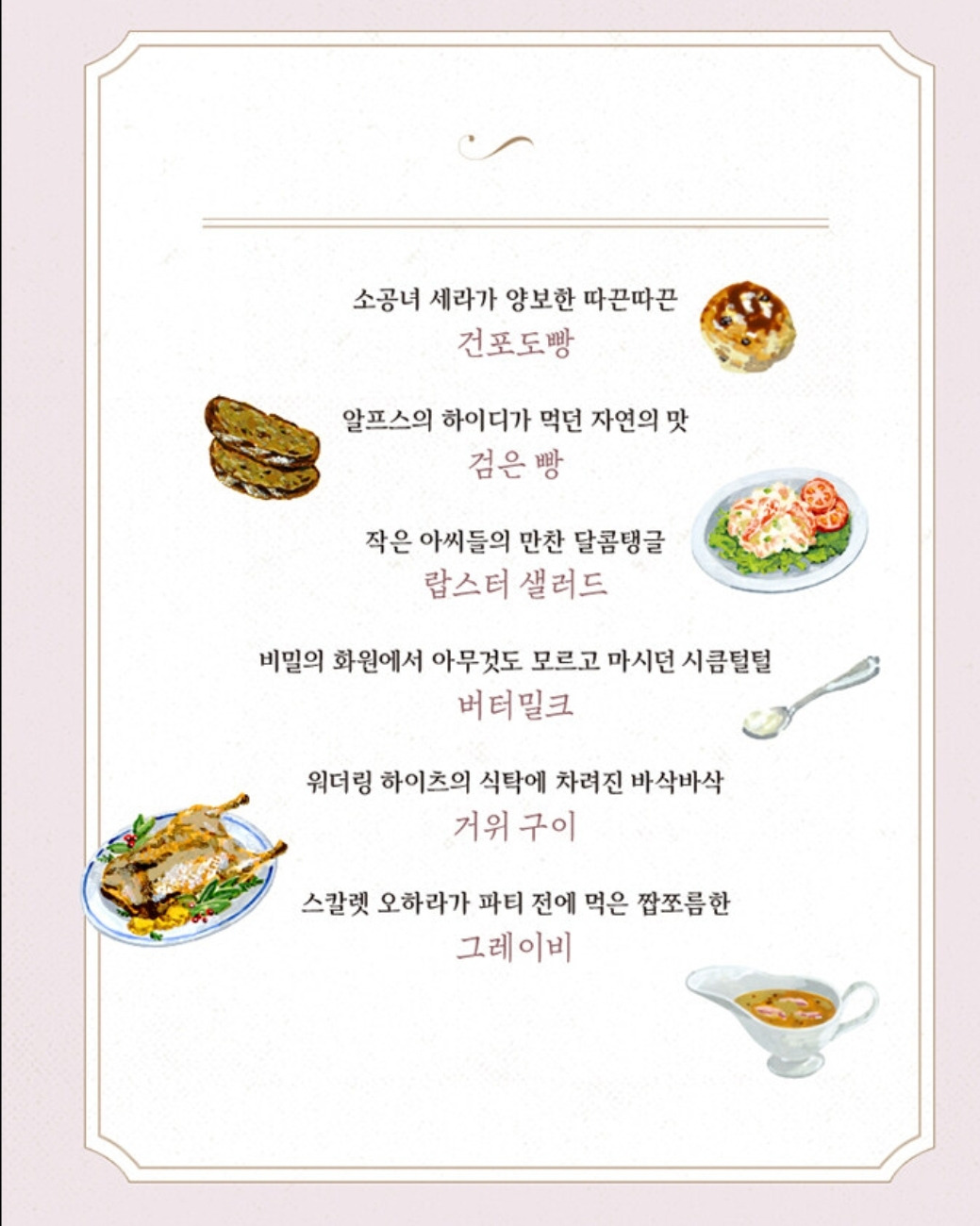 40여 개의 글들은 다양한 역할로 독자를 이끈다. 소공녀와 작은 아씨들을 읽던 어린 소녀의 마음을 떠올리게 하고, 제목만 알고 읽은 척 지났던 소설을 읽고 싶게 한다. 전채요리처럼 독서욕을 돋운다. 나는 그 미끼에 걸려 거위구이 요리로 소개된 에밀리 브론테의 《폭풍의 언덕》을 읽었는데 요새 막장 드라마에 버금가는 스토리 흡입력에 빠져 버렸다.