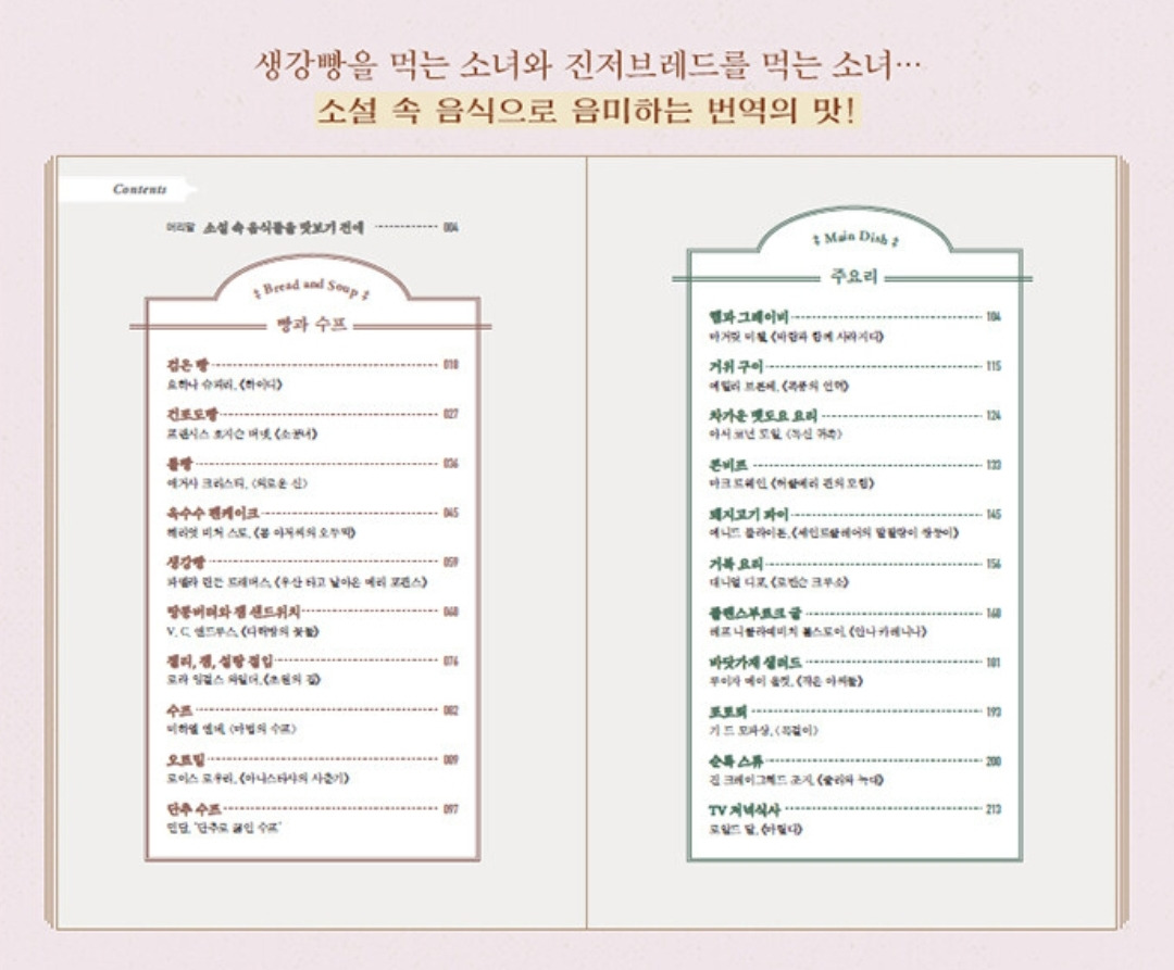 부제에 번역가가 쓴 번역 이야기라 쓰여 있지만 그 내용이 크지 않아 어떤 독자에게는 아쉬움 일 수 있다. 그러나 번역가라는 직업이 글자를 글자로 옮기는 사람이 아닌 번역을 통하여 원작의 느낌을 최대한 전달하는 직업이라고 넓게 생각하면 음식을 통해 소설과 그 주변 이야기를 써낸 이 책은 나름의 번역가 역할이 한 것이라고 생각하고 싶다.