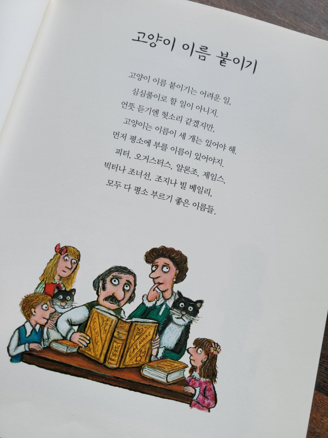 책은 고양이가 3개의 이름을 가지고 있다는 '고양이 이름 붙이기'라는 주제로 시작한다. 세 가지 이름 중 하나는 아무에게도 알려주지 않은 고양이 혼자만 아는 이름이 있다고 한다. 고양이에 대한 신비로운 고정관념은 어디서나 공통점인 듯하다. 이런 도입은 여러 고양이들의 히스토리를 상상해주기 충분하며 고양이들의 서사와 모험, 삶의 이야기가 시작된다.