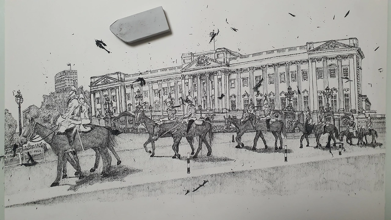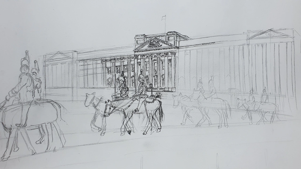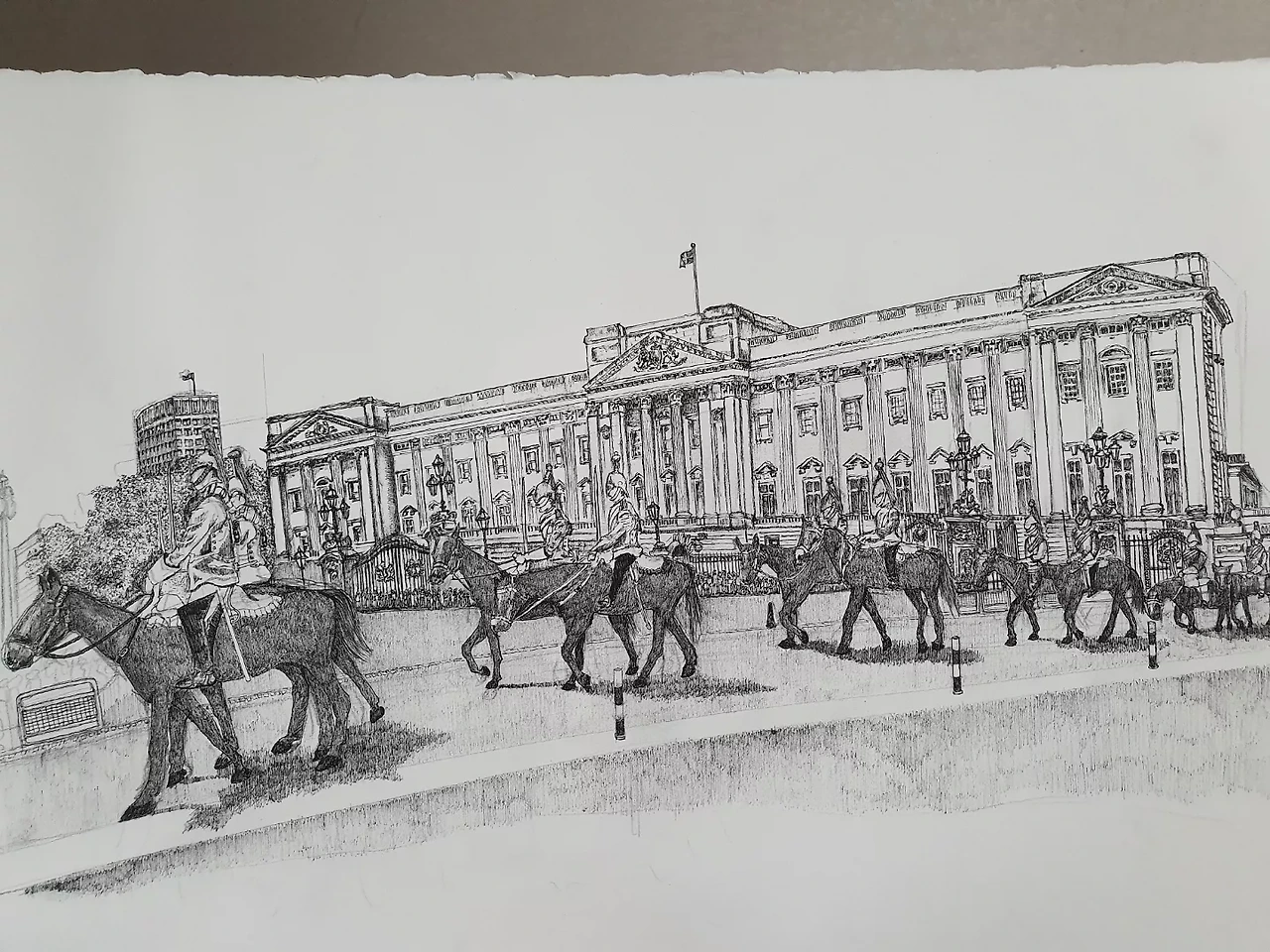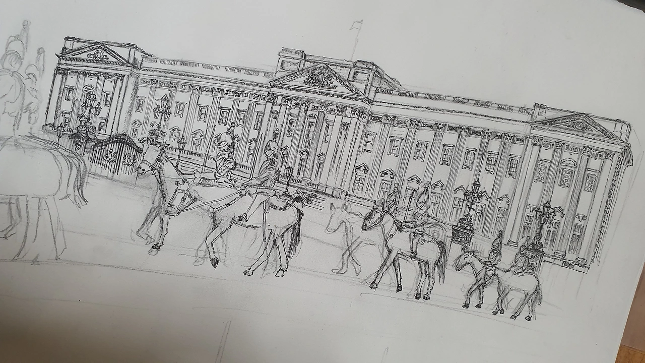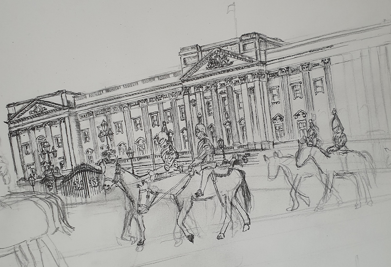 한국으로 돌아가면 영국의 풍경들을 그리고 기록을 해두는 '#영국을 담다'(인스타그램 해시태그) 시리즈를 이어가기 위해 사진을 최대한 많이 찍어왔고 2020년 1월에 '버킹엄 궁전 풍경'을 A3(297mm x 420mm) 크기의 종이에 그려나가기로 마음먹었다. 내 기준에서는 큰 그림에 속했고 처음엔 호기롭게 그려나가다 이내 멈춰버리고 만다.