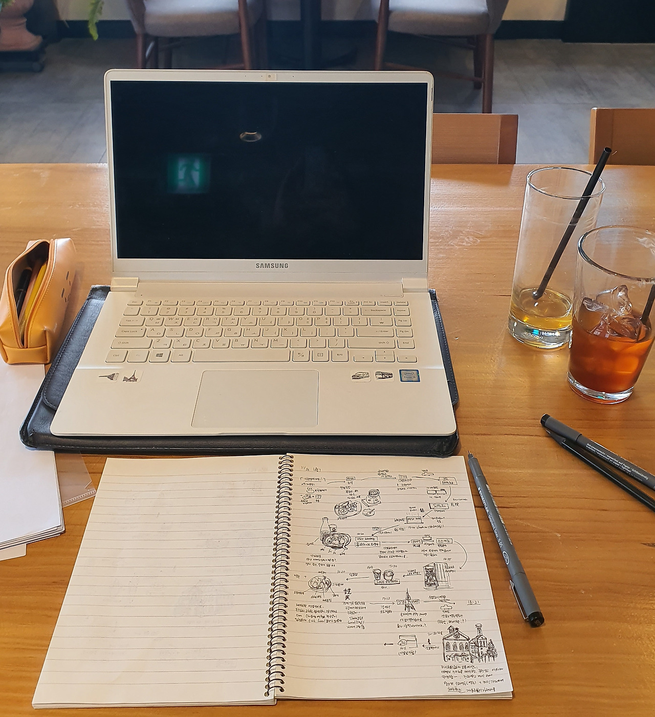 사실 일본을 다녀온 뒤, 글로 담으려 생각할 때만 해도 한 편에 모두 쓰고 끝낼 계획이었다. 하지만 여행을 마치고 한국으로 귀국한 다음 날, 혼자 카페에 가서 나만의 방식으로 그날그날의 여행 정리하니 여러 가지 이야기들이 떠올랐고 이를 풀어내면 길어질 거라 생각하게 되었다. 인상 깊었던 것들은 직접 그리면서 시계열별로 메모해 나갔다. 그렇게 4박 5일간의 일본 여행을 꼬박 4시간 남짓 넘어서야 완성하게 된다. 아이스 아메리카노 두 잔, 앙버터 빵과 함께 빚어낸 결과였다.