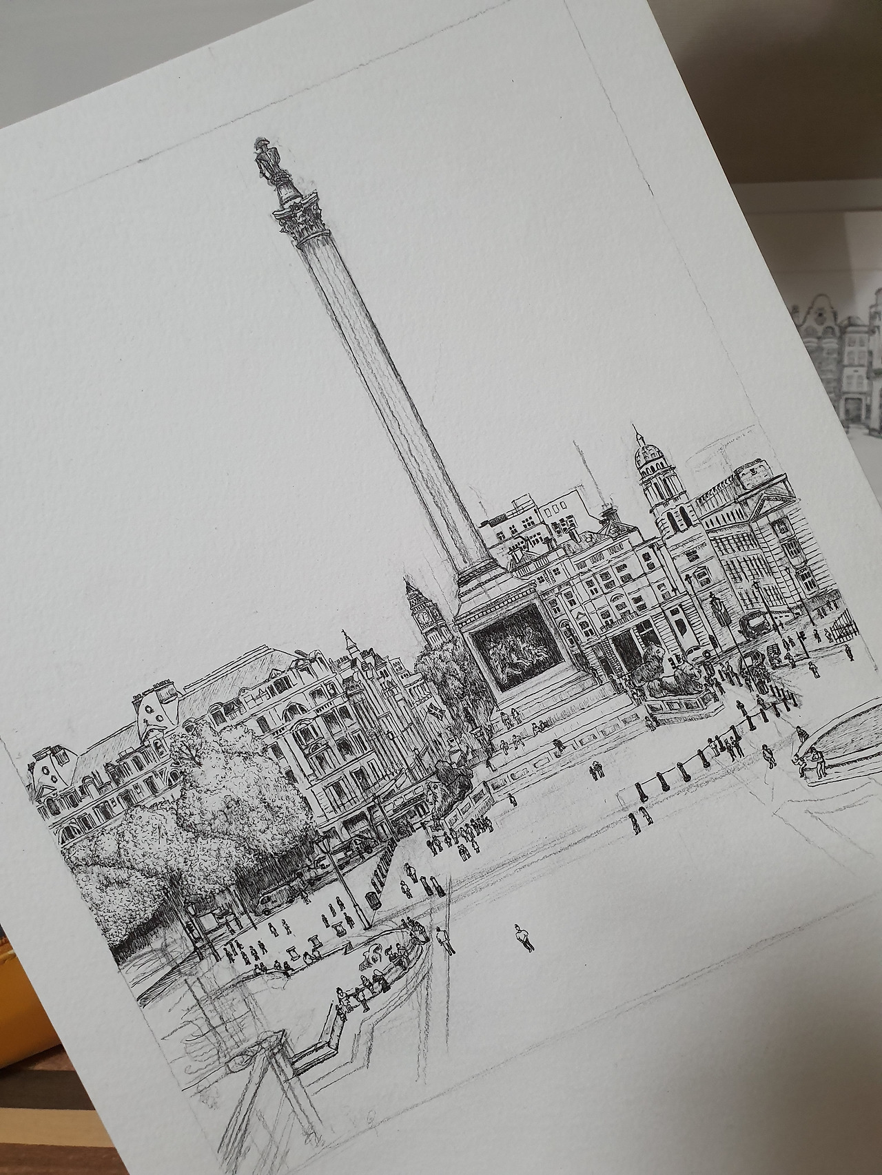 최근 드로잉에 몰두하고 있는 풍경은 영국 런던의 내셔널갤러리에서 바라본 모습이다. 요즘 그리는 것에 어려움이 있었는데 평소 그리는 것보다 비교적 큰 그림을 다루다 보니 시간이 많이 소요된다는 점과 세밀하게 표현함에 있어 직접 찍어온 사진은 오래되다 보니 화질이 선명하지 못한 점이다. 그래서 그리다가도 멈출 때가 많았다. 그렇다고 중단은 아니다. 시간이 걸리더라도 끝은 내야 한다.