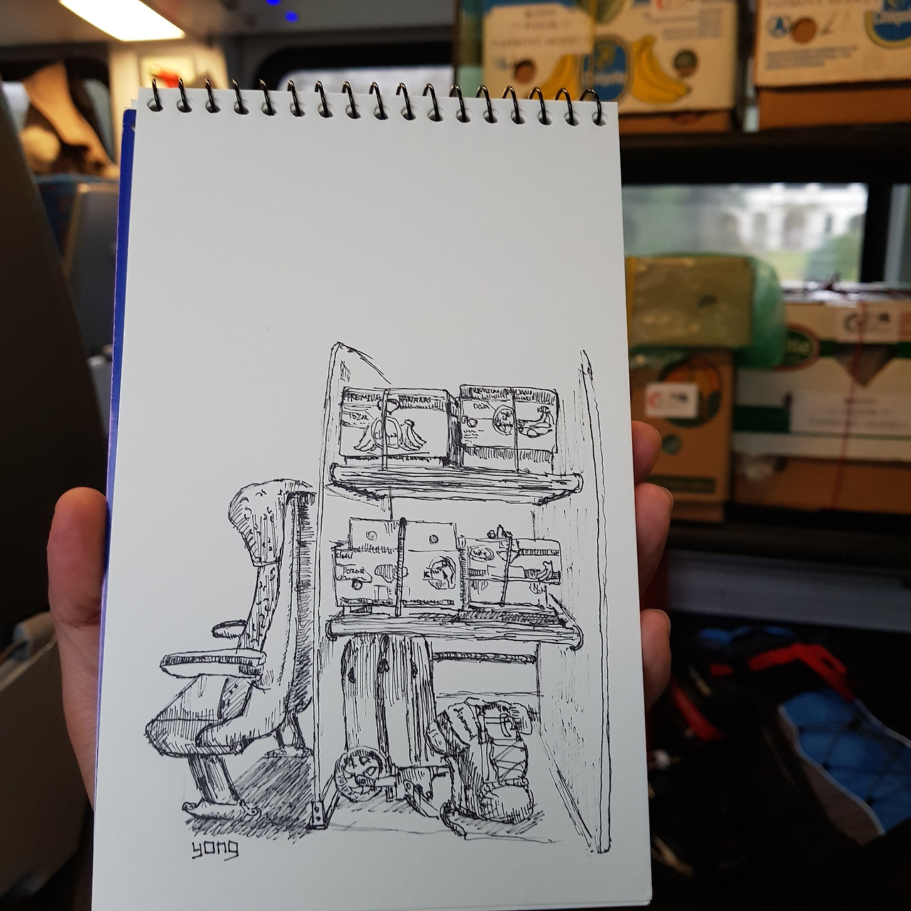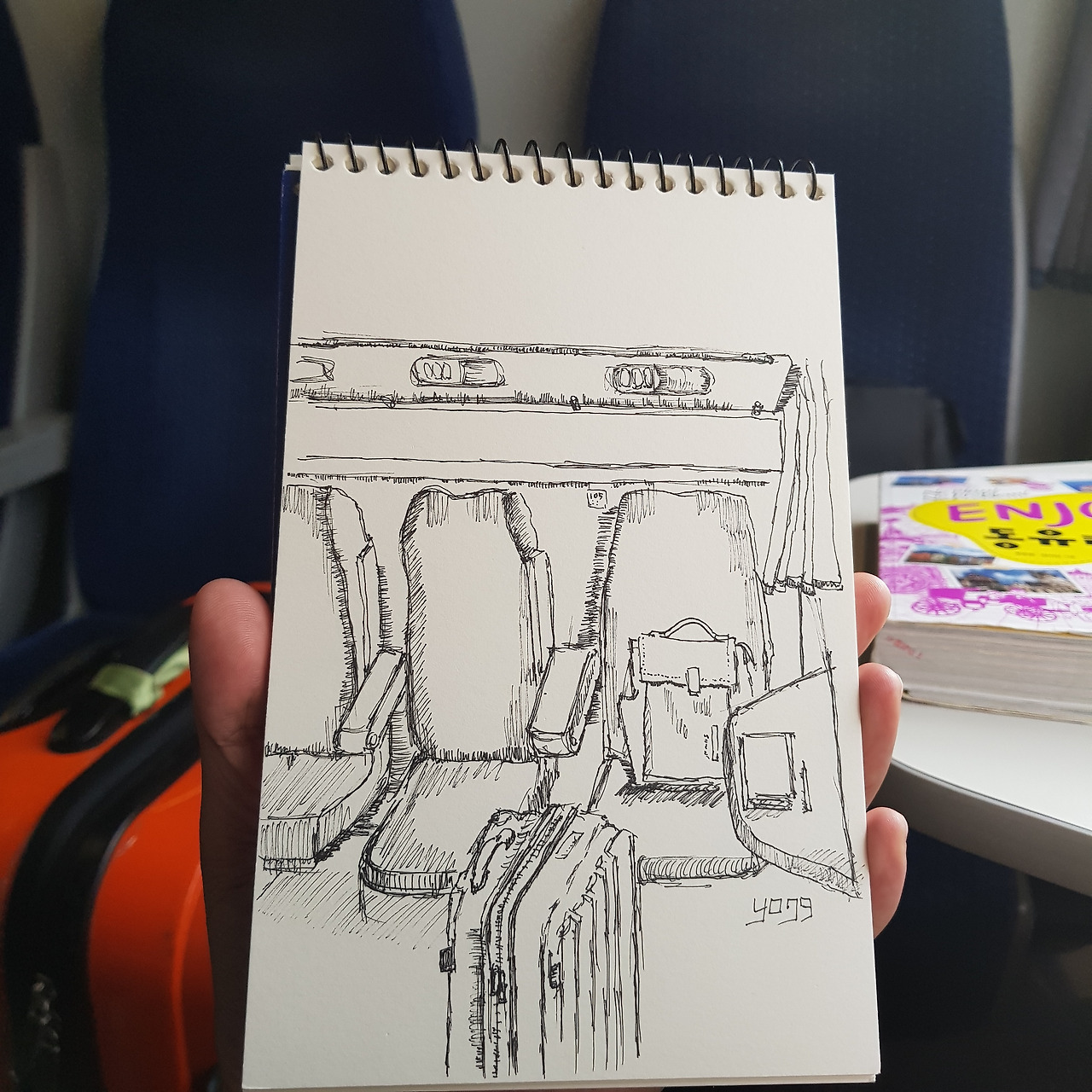 동유럽 여행할 때 2019년 8월에 런던 3일, 파리 2일 그리고 다시 돌아와 런던 3일 여행했던 것처럼 프라하에서 시작해서 비엔나에서 2박 3일 하고 다시 프라하로 돌아왔다. 그때도 프라하가 많이 그립고 후회할 수 있겠다고 생각했나 보다. 많이 돌아다니느라 발은 쉬어야 했고 상대적으로 편했던 손은 기차 안에서 다시 펜과 함께했다. 찍은 사진을 보고 그리는 것이 아니라, 그리는 대상을 보면서 그렸다. 그리면서 짐들이 중간중간 주인이 내려야 해서 갖고 가면 안되는데라고 생각했다. 사진은 그 순간 모든 것이 정지되어 간직되지만 현장에서 직접 보는 것은 언제든 변할 수 있으니.