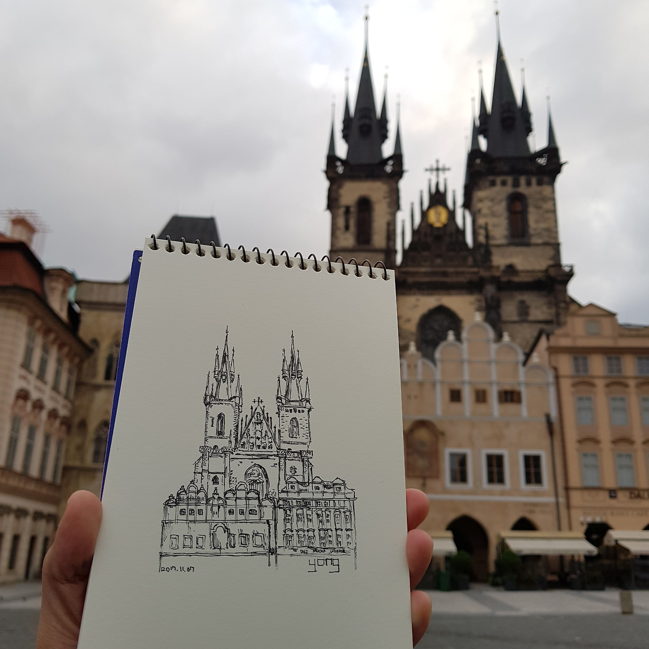 '프라하'를 검색하거나 TV 속에 동유럽 여행 소개해주는 여행사 광고에 꼭 나오는 풍경중 하나가 '틴 성당'이 아닐까 싶다. 구 시가지 광장 앞에는 버스킹도 하고 먹을거리도 많아 사람들이 많이 몰린다. 구 시가지 광장의 어느 가게 야외석에 앉아 햄버거와 맥주를 먹으며 드로잉 했던 추억이 떠오른다.