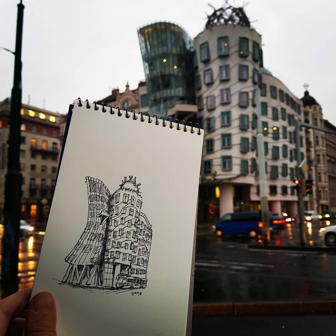 블타바 강 근처에 위치한 '댄싱 하우스'. 명칭만큼이나 역동적인 느낌의 건축이다. SNS에서 많이 봤었던 건물이라 꼭 직접 보고 싶었는데 알고 보니 프라하에 있다는 것이었다. 실제로 보니 더욱 커 보이고 신기했다. 안에 들어가 볼 걸 하는 아주 약한 후회가 남아있다. 목을 축이러 맥도날드에 가서 콜라를 마시며 드로잉 마무리했던 기억이 선명하다.