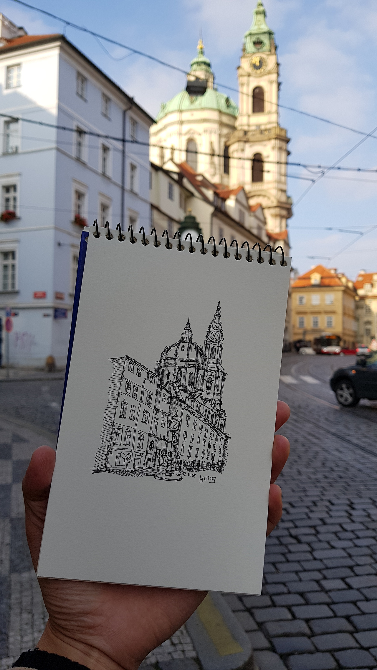 체코의 유명 음식, 한국으로 치면 족발요리의 일종인 '꼴레뇨'를 먹으러 음식점을 향했다. 들어가기 전에 본 말라 스트라나 지구 풍경이 너무 아름다웠다. 급하게 그렸긴 했지만 꼴레뇨를 기다리면서 신속하게 펜을 움직이며 그리고 다 먹고 나서도 마무리를 했다. 아쉬움 없이 먹고자 꼴레뇨를 시켰는데, 두 명이 먹어도 충분히 남을 만큼의 양이어서 다 먹지 못했다. 그때 느꼈다. ' 혼자 여행하면 아쉬운 게 음식 양이나 종류에 제한이 있다는 것이구나'라고.