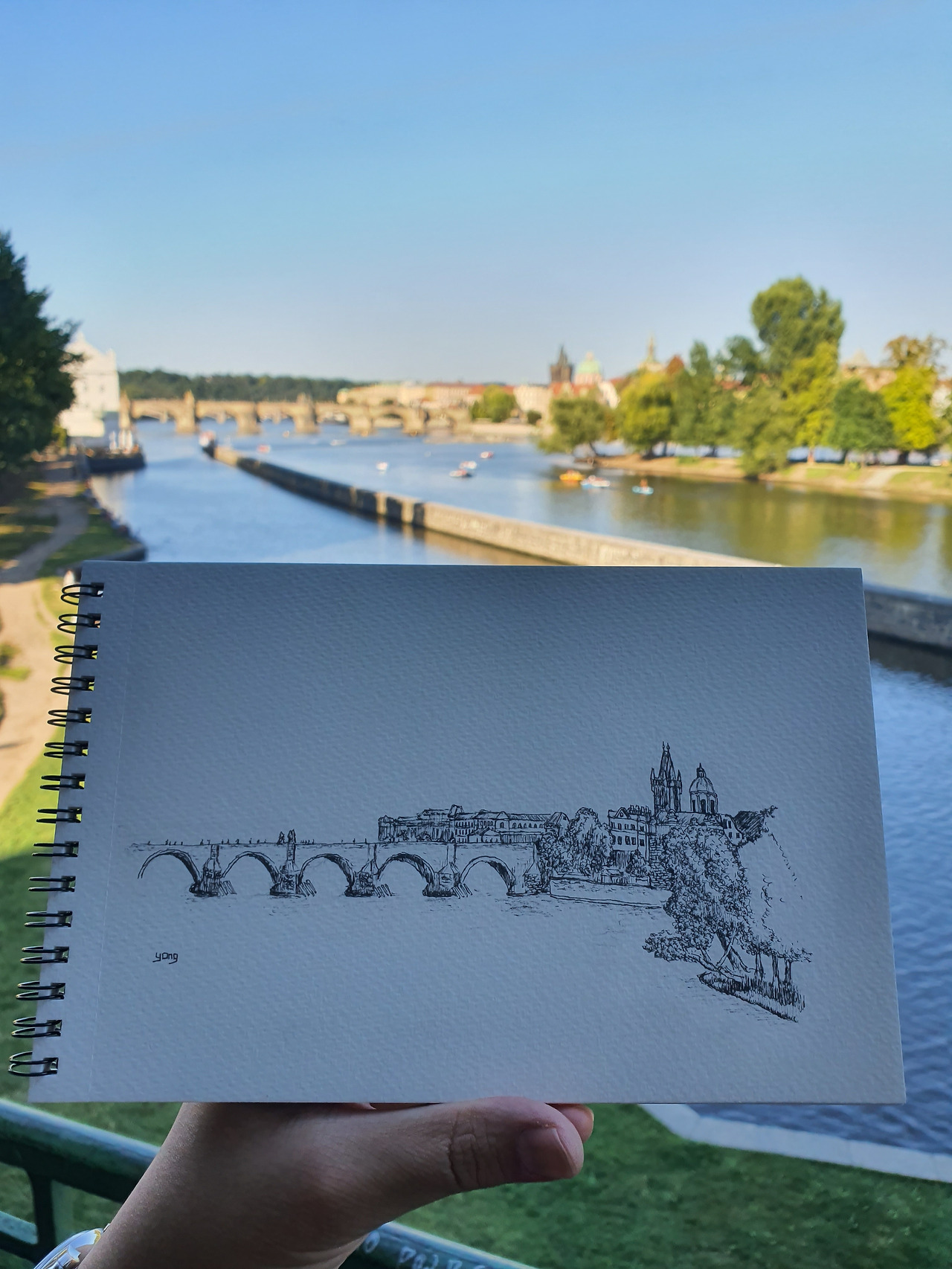 여행이 끝나갈 무렵, 프라하 하면 빼놓을 수 없는 까를교를 원 없이 바라보고 그릴 수 있는 기회가 생겼다. 근처 캄파지구의 박물관을 보러 갔다가 야외에 앉을 수 있는 카페를 발견했다. 당연히 사람들은 모두 앉아 있었고 까를교가 보인다는 이유로 약 20분 정도 기다려서 좋은 자리에 앉을 수 있었다. 야채주스를 시작으로 다른 과일 음료, 더 나아가 알리오올리오, 야채샐러드까지 이어졌다. 오후 세시부터 다섯 시 반까지 마시고 먹으며 찬찬히 그려나가서 완성했고 뿌듯한 마음에 기분은 한껏 더 좋아졌다.