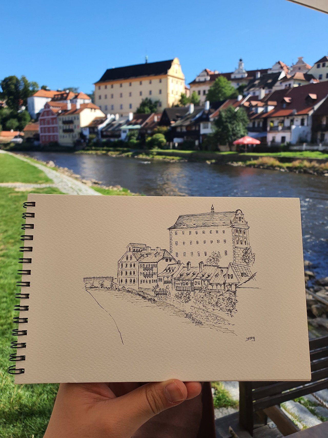 이번 여행에서는 지난 여행과 같이 그림을 많이 그리진 못했지만 틈이 있을 때는 여유를 만들어서 펜을 잡았다. 보통 카페에서 쉴 때 보이는 풍경을 기준으로 그림을 그렸다. 체스키크룸로프라는 근교에 당일치기 일정으로 버스를 타고 가서 충분히 여행하고 쉼이 필요할 때 흐르는 강이 보이는 곳의 카페에 앉아 커피, 과일 음료 등을 마시며 풍경을 그림으로 담았다. 돌아가야 할 버스 시간이 있었기에 마무리하지 못하고 돌아왔지만 마지막까지 그린 그림 그대로 남겨두었다. 완성하지 못한 그림 자체로도 여행 추억을 고스란히 느낄 수 있는 선물이 되어 준다.