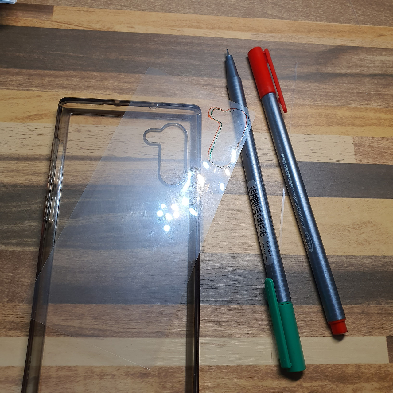 첫 시작은 아무래도 투명케이스에 딱 맞아떨어지는 투명 파일 크기 맞추기다. 자로 길이 재보고, 케이스 뒤에 넣어보면서 크기를 맞춰 잘랐다. 다음은 '카메라 렌즈 위치에 맞춰 뚫기'다. 애초에 제대로 못 잘라서였을까. 케이스에 대보니 투명 파일이 조금씩 움직였다. 그래서 움직일 때마다 라인을 맞춰 그렸다(아래 빨간색, 초록색 펜 표시). 여기서 움직임으로 인해 발생할 수 있는 가려짐을 막기 위해 두 라인에서 안쪽만 도려내는 것이 핵심이다. 어떻게 움직이더라도 카메라 렌즈, 라이트를 가리면 안 되니까.