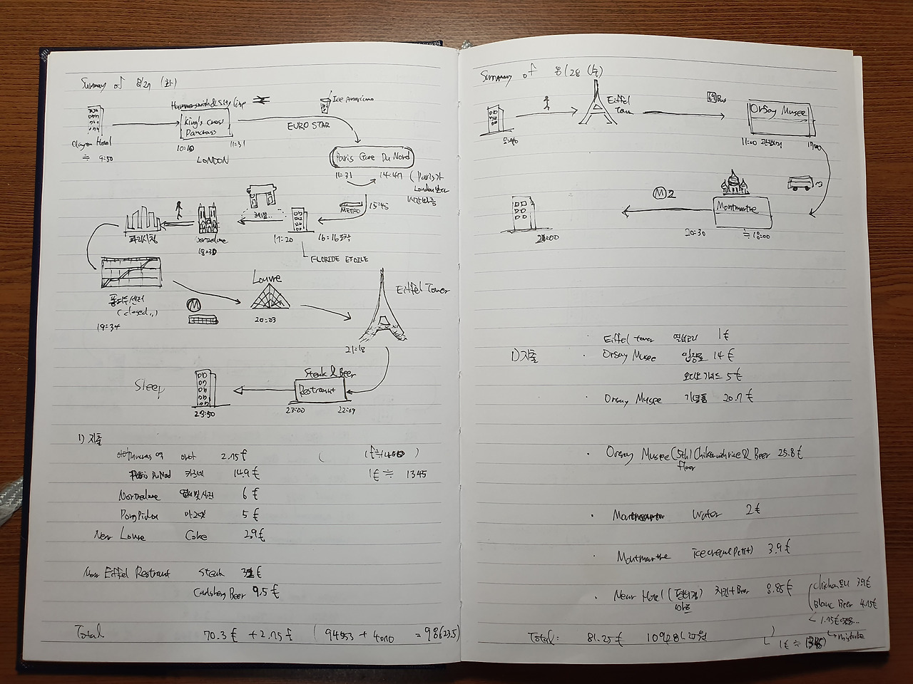 여행을 하다 보면 일기를 꼬박꼬박 다 쓰기로 다짐하지만 일정이 너무 빠듯해서 몸이 너무 힘들어서 못 쓰는 경우가 생긴다. 뒤늦게라도 쓰면 다행이지만 그마저도 쉽지 않은 상황이라면 '한 페이지에 요약'해서 그때 있었던 순간을 간직하는 것이 어떨까.