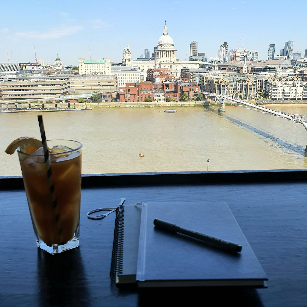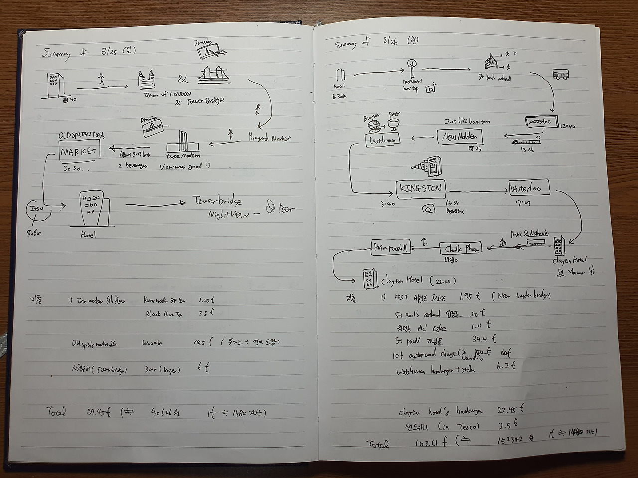 테이트 모던의 어느 카페 노트에 일기를 쓰는 것은 뒤 편에서부터 쓰고 앞쪽에는 미리 몇 페이지 가량 비워뒀다. 비워둔 페이지는 하루에 있었던 일들을 간략하게 시각적으로 표현한 그림으로 채워졌다. '런던 테이트 모던에 가서 그림을 그렸을 때가 언제였고 어느 정도 있었지?' 궁금해할 때면 일기 노트를 꺼내 들고 앞에 날짜별 하루에 요약했던 것을 보면 금방 찾을 수 있었다. '타워브릿지에서 버러 마켓을 지나 테이트 모던까지 걸어갔었고 약 2~3시간 테이트 모던 카페에 앉아서 창밖으로 보이는 풍경을 2~3시간가량 앉아서 그림 그렸는데, 한 음료로 오래 있는 것은 민폐라 생각해서 두 잔을 마셨구나'라는 것을 확인할 수 있었다.