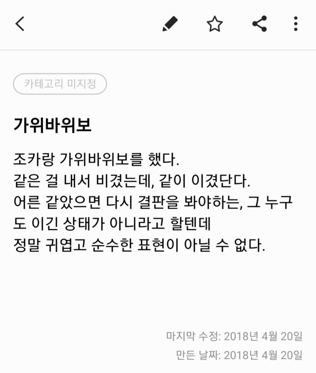 조카와 가위바위보 하면서 한 번은 똑같은 걸 냈다. 그러자 "어, 같이 이겼다"라고 천진난만하게 말했다. 같은 걸 냈는데 같이 이겼다니.. 정말 살면서 한 번도 듣지 못했던 말이었다. 보통 비겼을 경우, 다시 승부를 봐야 하는 상태, 그 누구도 이기지 않은 상태, 아무것도 정해진 것 없는 상태로 흔히 생각할 것이다.