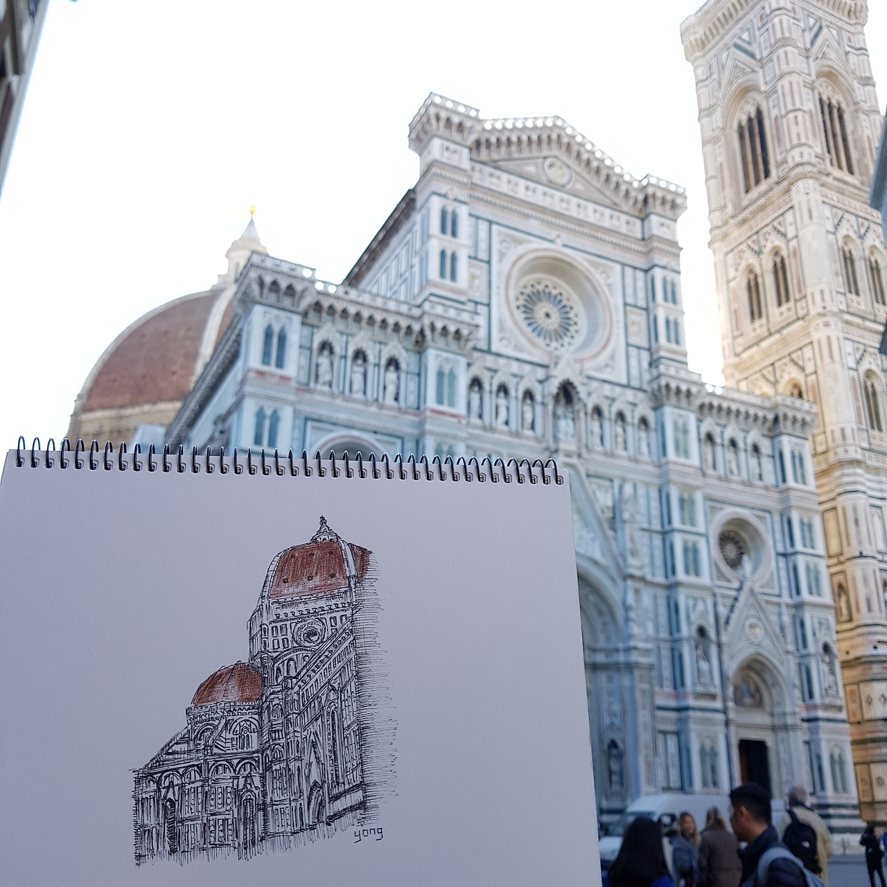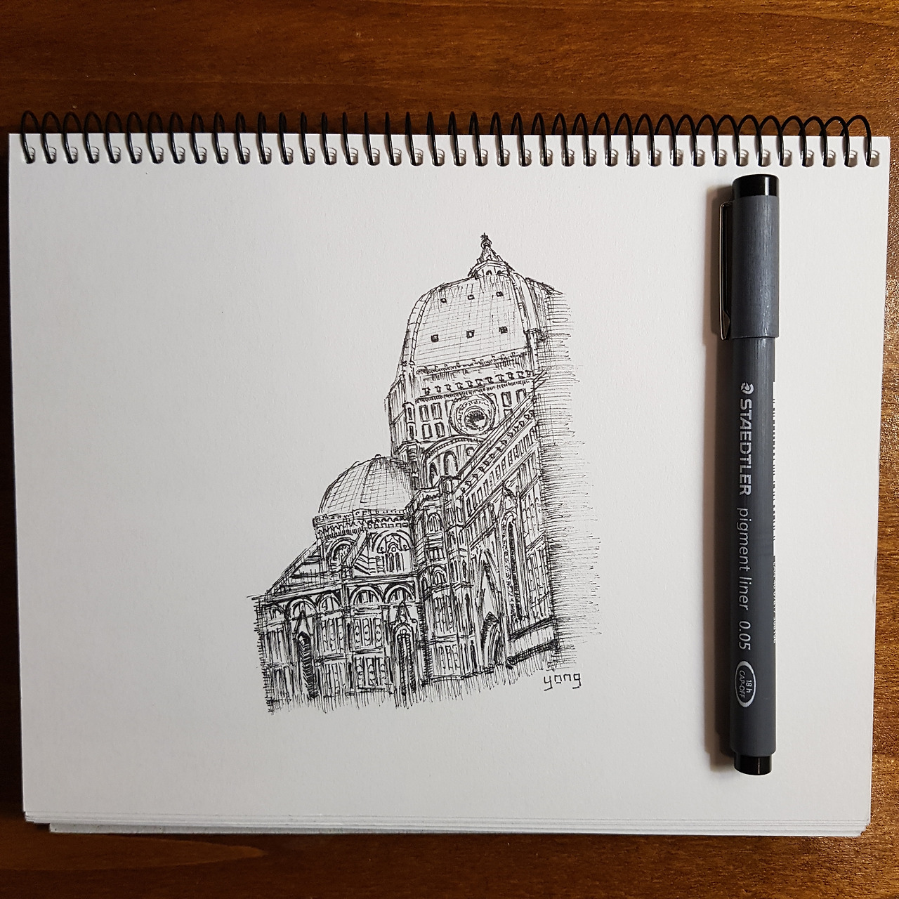 피렌체에 도착하고 얼마 걷지 않아 커다란 두오모 성당이 보였다. 그 근처 숙소에 짐을 풀고 자세히 보러 나섰는데 자연스레 두오모 성당을 피렌체에서 그리고 싶어 졌다. 나만의 여행 추억을 위해서. 시간적 공간적 여건상 직접 보며 그리기보다는 피렌체 숙소에서 머물며 아침 일과 시작 전이나 잠에 들기 전 틈날 때마다 그려서 완성해 나갔다. 완성되가는 그림을 볼 때면 뿌듯했다.