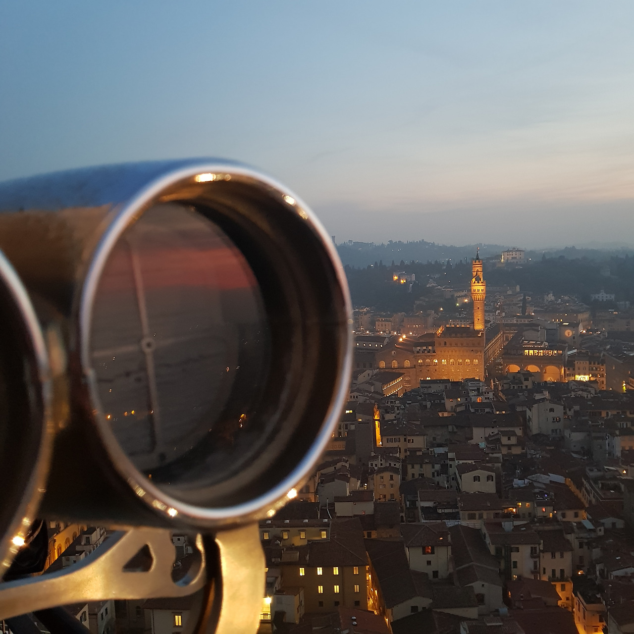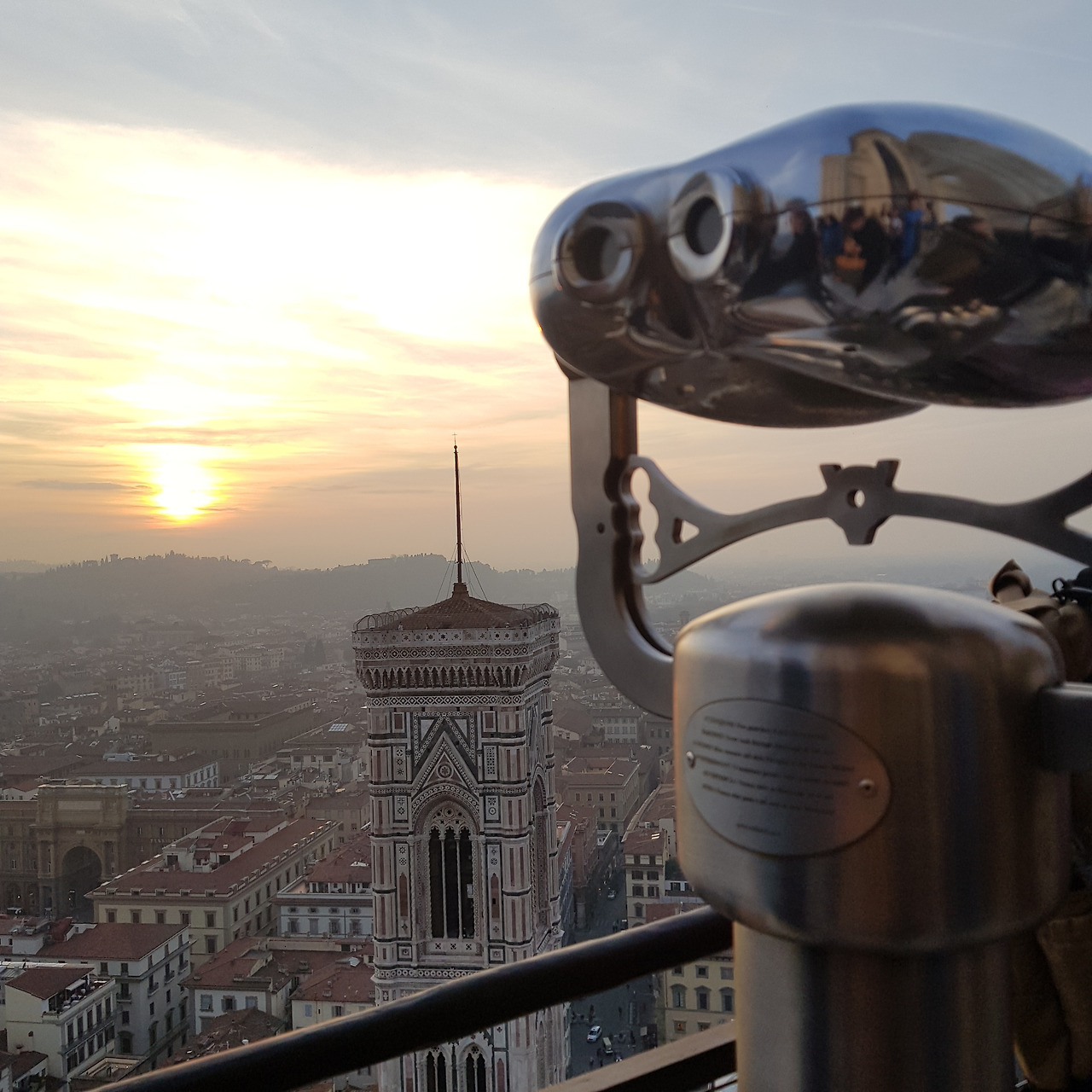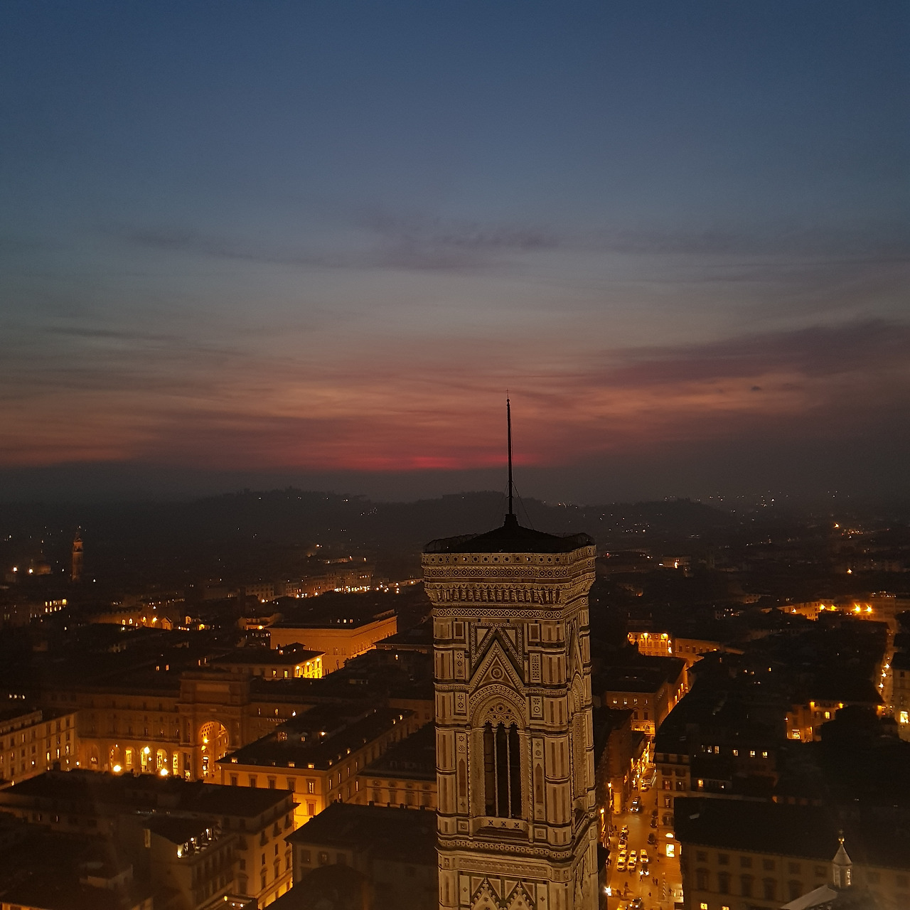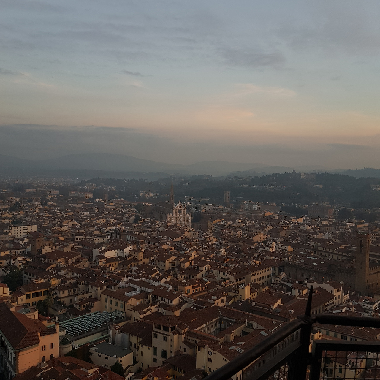 30분 남짓 계단을 오르니 두오모 성당 큐폴라에 다다를 수 있었다. 거기에서 바라본 피렌체의 탁 트인 모습은 말로 표현하기 어려울 만큼 아름다웠다. 게다가 서서히 해가 저물어가고 있었던 시간대라 큐폴라를 돌면서 이곳저곳 풍경들을 보다 보니 자연스레 붉어지며 어두워져 갔다. 낮에 가면 볼 수 있는 풍경에서부터 노을이 지고 어두워져 불빛들이 어두움을 상대로 강하게 밝아 보일 때까지 있다 보니 하루 온종일 머물다 가는 느낌이었다.